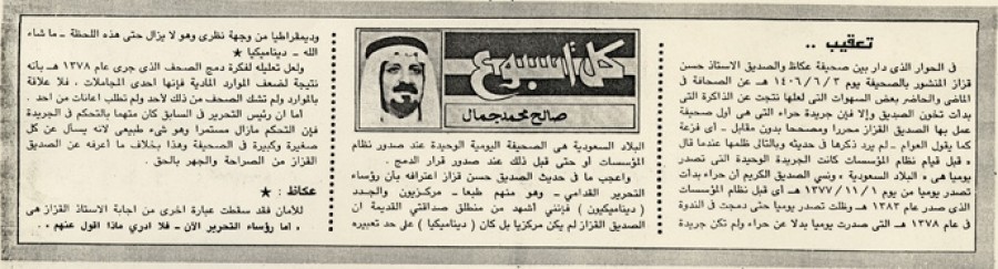 وأعجب ما في حديث الصديق حسن قزاز اعترافه بأن رؤساء التحرير القدامى - وهو منهم طبعاً - مركزيون والجدد (ديناميكيون) فإنني أشهد من منطلق صداقتي القديمة أن الصديق القزاز لم يكن مركزياً بل كان (ديناميكيا) على حد تعبيره وديمقراطيا من وجهة نظري وهو لا يزال حتى هذه اللحظة – ما شاء الله – ديناميكيا.