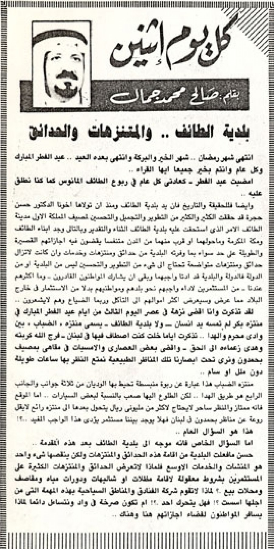 أمضيت عيد الفطر- كعادتي كل عام في ربوع الطائف المانوس كما كنا نطلق عليه.. وأيضاً فللحقيقة والتاريخ فإن يد بلدية الطائف ومنذ أن تولاها أخونا الدكتور حسن حجرة قد حققت الكثير و الكثير من التطوير والتجميل والتحسين بمصيف المملكة الأول مدينة الطائف الأمر الذي استحقت عليه بلدية الطائف الثناء والتقدير وبالتالي وجد أبناء الطائف ومكة المكرمة وما حولهما أو قرب منهما من المدن متنفسا يقضون فيه إجازاتهم القصيرة والطويلة على حد سواء بما وفرته البلدية من حدائق ومنتزهات وخدمات وإن كانت لا تزال حدائق ومنتزهات متواضعة تحتاج إلى شئ من التطوير والتحسين ليس من البلدية أو من الدولة فالدولة والبلدية قد أدتا واجبهما وبقي أن يشارك المواطنون القادرون – وما أكثرهم عندنا- من المستثمرين لأداء واجبهم نحو بلدهم ومواطنيهم بدلاً من الاستثمار في خارج البلاد مما عرض وسيعرض أكثر أموالهم إلى التآكل وربما الضياع وهم لا يشعرون.. لقد تذكرت وأنا أقضي نزهة في عصر اليوم الثالث من أيام عيد الفطر المبارك في منتزه بكر لم تمسه يد إنسان- ولا بلدية الطائف – يسمى منتزه(الضباب) بين وادي محرم والهدا.. تذكرت أياماً خلت كنت اصطاف فيها في لبنان – فرج الله كربته وهدى زعماءه إلى الحق- وأقضي بعض العصاري والأمسيات في مقاهي بمصيف بحمدون ونرى تحت أبصارنا تلك المناظر الطبيعية نمتع النظر بها ساعات طويلة دون ملل أو سأم.. منتزه الضباب هذا عبارة عن ربوة منبسطة تحيط بها الوديان من ثلاثة جوانب والجانب الرابع هو طريق الهدا.. لكن الطلوع إليها صعب بالنسبة لبعض السيارات.. أما الموقع فإنه ممتاز والمنظر ساحر لا يحتاج لأكثر من مليوني ريال يتحول بعدها إلى منتزه رائع لا يقل روعة عن مناظر بحمدون في لبنان فهلا يوجد بيننا مستثمر يؤدى هذا الواجب المفيد..؟!