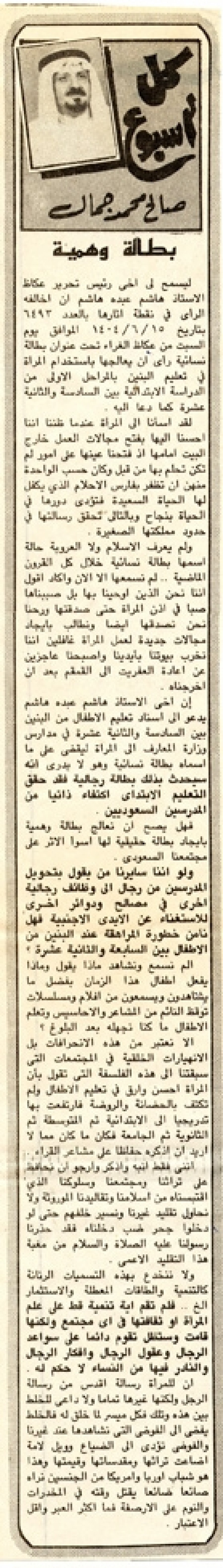 ليسمح لى أخى رئيس تحرير عكاظ الأستاذ هاشم عبده هاشم أن أخالفه الرأي في نقطة أثارها بالعدد 6493 بتاريخ 15/6/1404 الموافق يوم السبت من عكاظ الغراء تحت عنوان بطالة نسائية رأى أن يعالجها باستخدام المرأة في تعليم البنين بالمراحل الأولى من الدراسة الابتدائية بين السادسة والثانية عشرة كما دعا إليه.