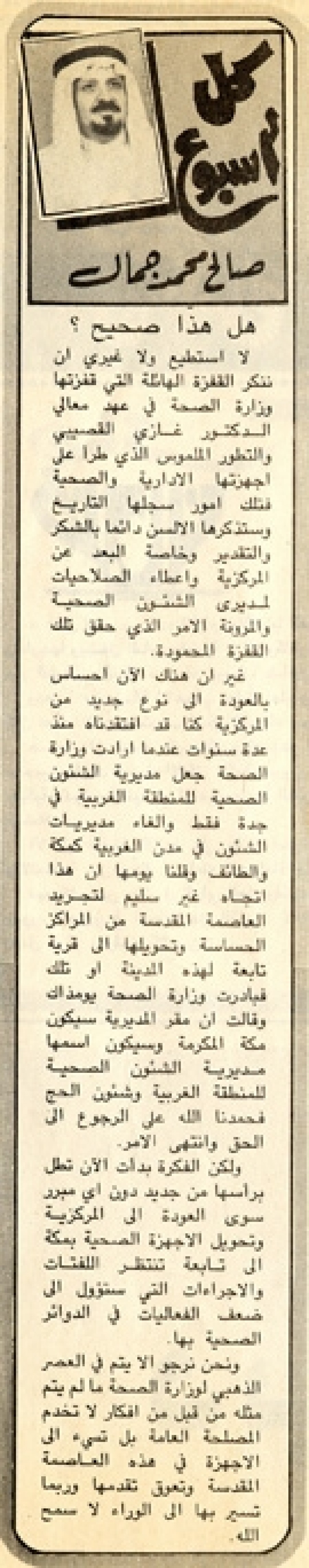 غير أن هناك الآن إحساس بالعودة إلى نوع جديد من المركزية كنا قد افتقدناه منذ عدة سنوات عندما أرادت وزارة الصحة جعل مديرية الشئون الصحية للمنطقة الغربية في جدة فقط وإلغاء مديريات الشئون في مدن الغربية كمكة والطائف وقلنا يومها أن هذا اتجاه غير سليم لتجريد العاصمة المقدسة من المراكز الحساسة وتحويلها إلى قرية تابعة لهذه المدينة أو تلك فبادرت وزارة الصحة يومذاك وقالت أن مقر المديرية سيكون مكة المكرمة وسيكون اسمها مديرية الشئون الصحية للمنطقة الغربية وشئون الحج فحمدنا الله على الرجوع إلى الحق وانتهى الأمر.