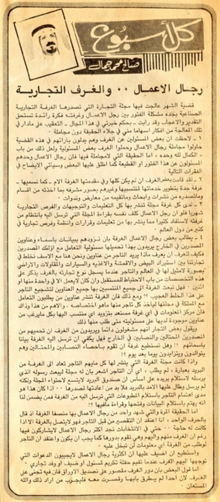 قضية الشهر عالجت فيها مجلة التجارة التي تصدرها الغرفة التجارية الصناعية بجدة مشكلة الفتور بين رجل الأعمال وغرفته فكرة رائدة تستحق التقدير والإعجاب وقد رأيت – بحكم خبرتي في هذا المجال – التعقيب على ما دار في تلك المعالجة من أفكار إسهاما مني في جلاء الحقيقة دون مجاملة.