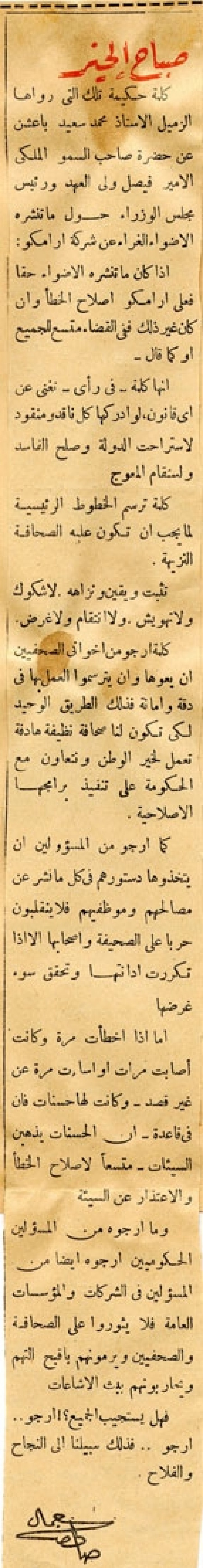 كلمة حكيمة تلك التي رواها الزميل الأستاذ محمد سعيد باعشن عن حضرة صاحب السمو الملكي الأمير فيصل ولى العهد ورئيس مجلس الوزراء حول ما تنشره الأضواء الغراء عن شركة ارامكو: