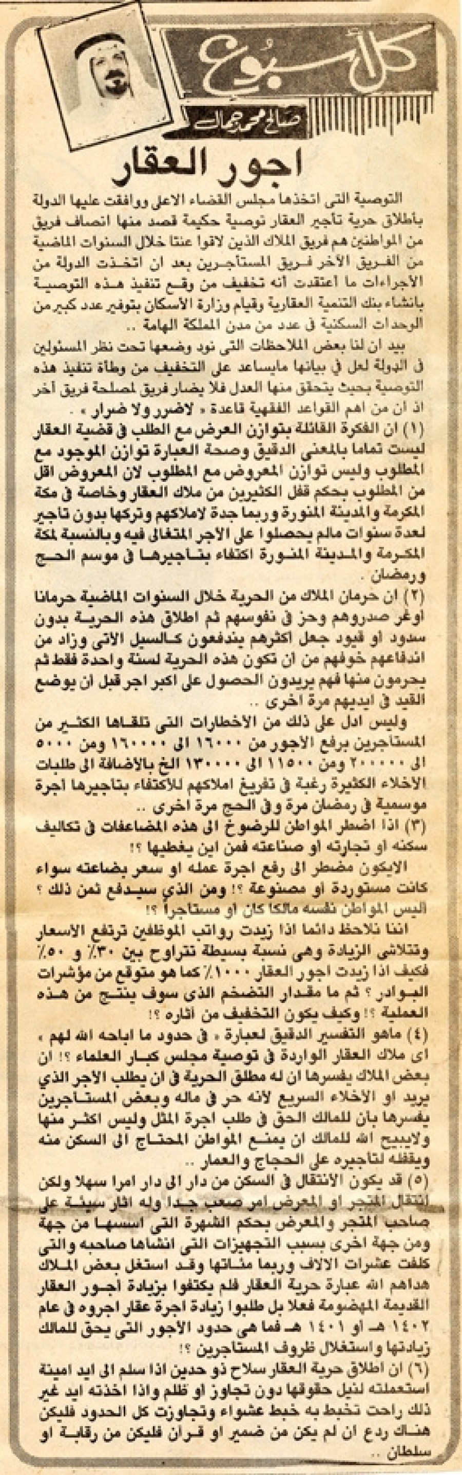 التوصية التي اتخذها مجلس القضاء الأعلى ووافقت عليها الدولة بإطلاق حرية تأجير العقار توصية حكيمة قصد منها أنصاف فريق من المواطنين هم فريق الملاك الذين لاقوا عنتا خلال السنوات الماضية من الفريق الآخر فريق المستأجرين بعد أن اتخذت الدولة من الإجراءات ما اعتقدت أنه تخفيف من وقع تنفيذ هذه التوصية بإنشاء بنك التنمية العقارية وقيام وزارة الإسكان بتوفير عدد كبير من الوحدات السكنية في عدد من مدن المملكة الهامة...