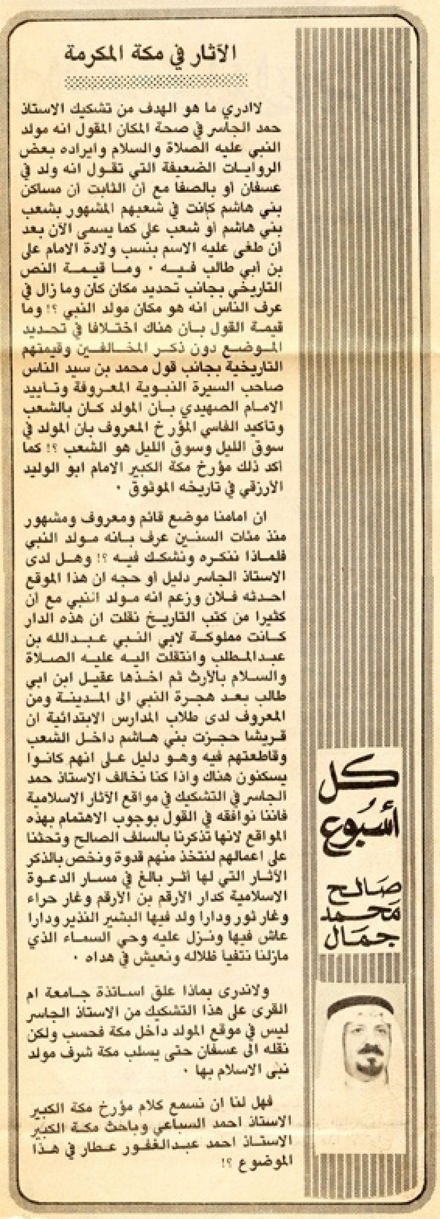 إن أمامنا موضع قائم ومعروف ومشهور منذ مئات السنين عرف بأنه مولد النبي فلماذا ننكره ونشكك فيه؟! وهل لدى الأستاذ الجاسر دليل أو حجة أن هذا الموقع أحدثه فلان وزعم أنه مولد النبي مع أن كثيرا من كتب التاريخ نقلت أن هذه الدار كانت مملوكة لأبي النبي عبد الله بن عبد المطلب وانتقلت إليه عليه الصلاة والسلام بالإرث ثم أخذها عقيل بن أبي طالب بعد هجرة النبي إلى المدينة ومن المعروف لدى طلاب المدارس الابتدائية أن قريشا حجزت بني هاشم داخل الشعب وقاطعتهم فيه وهو دليل على أنهم كانوا يسكنون هناك وإذا كنا نخالف الأستاذ حمد الجاسر في التشكيك في مواقع الآثار الإسلامية فإننا نوافقه في القول بوجوب الاهتمام بهذه المواقع لأنها تذكرنا بالسلف الصالح وتحثنا على أعمالهم لنتخذ منهم قدوة ونخص بالذكر الآثار التي لها أثر بالغ في مسار الدعوة الإسلامية كدار الأرقم بن الأرقم وغار حراء وغار ثور ودارا ولد فيها البشير النذير وداراً عاش فيها ونزل عليه وحي السماء الذي ما زلنا نتفيأ ظلاله ونعيش في هداه.