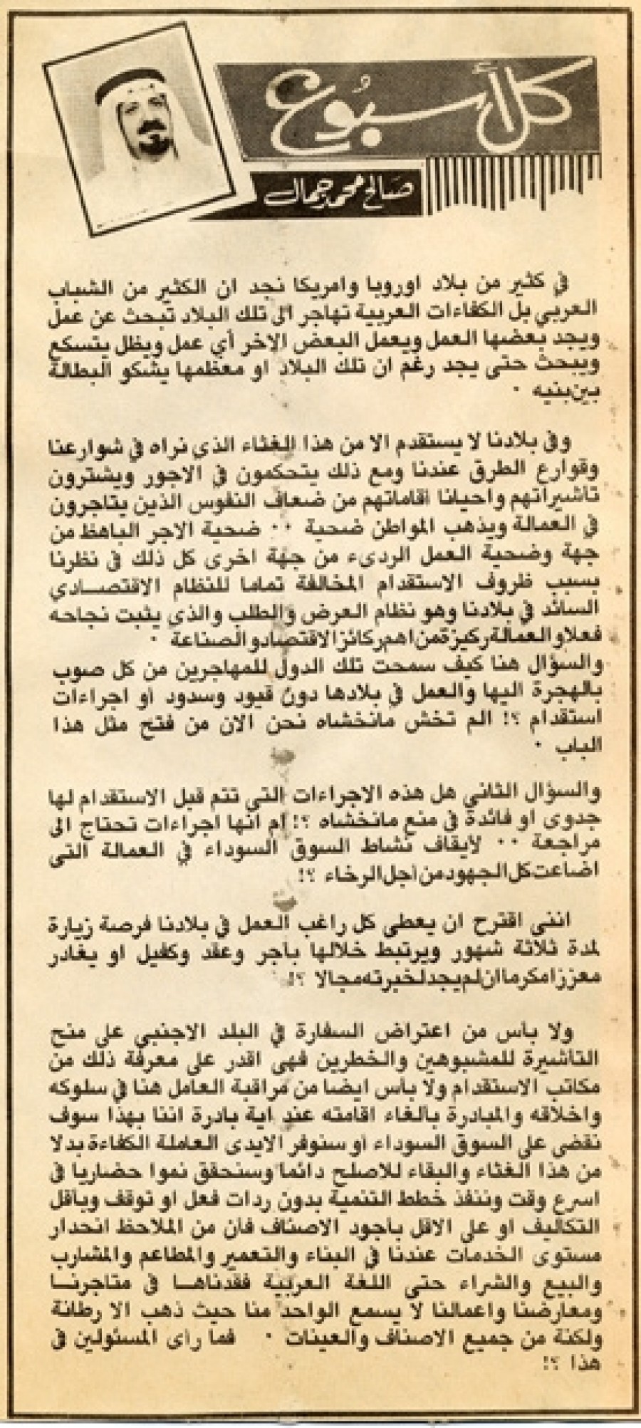 إنني أقترح أن يعطي كل راغب العمل في بلادنا فرصة زيارة لمدة ثلاثة شهور ويرتبط خلالها بأجر وعقد وكفيل أو يغادر معززا مكرما إن لم يجد لخبرته مجالا؟!