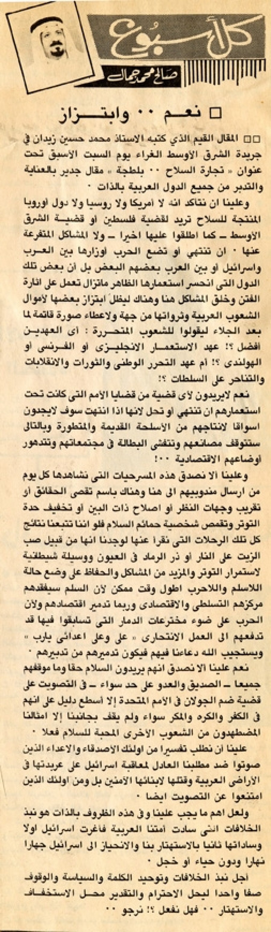 المقال القيم الذي كتبه الأستاذ محمد حسين زيدان في جريدة الشرق الأوسط الغراء يوم السبت الأسبق تحت عنوان "تجارة السلاح.. بلطجة" مقال جدير بالعناية والتدبر من جميع الدول العربية بالذات.