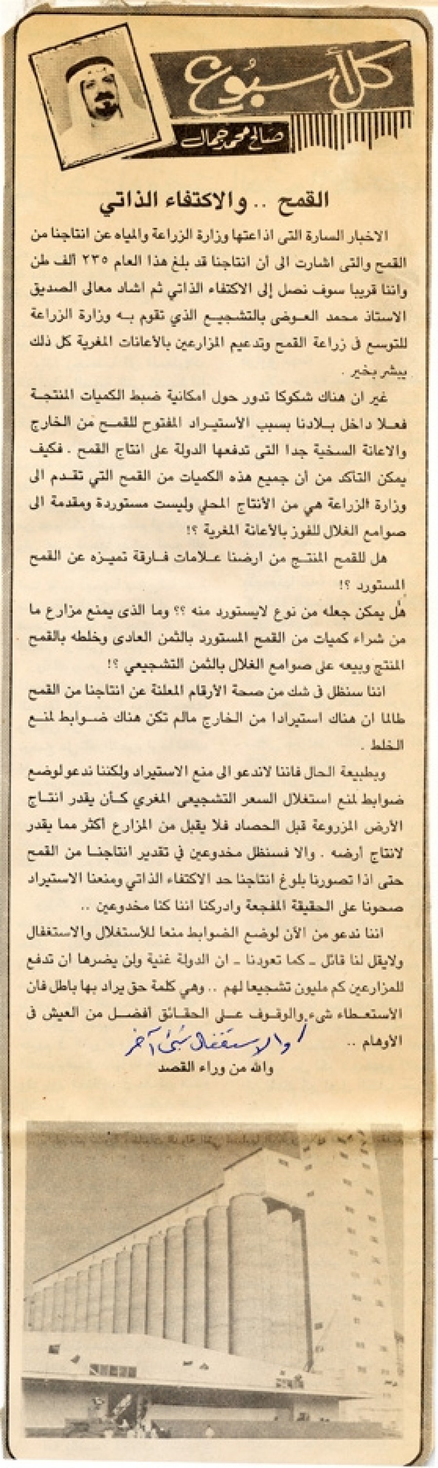 الأخبار السارة التي أذاعتها وزارة الزراعة والمياه عن إنتاجنا من القمح والتي أشارت إلى أن إنتاجنا قد بلغ هذا العام 235 ألف طن وأننا قريبا سوف نصل إلى الاكتفاء الذاتي ثم أشاد معالي الصديق الأستاذ محمد العوضي بالتشجيع الذي تقوم به وزارة الزراعة للتوسع في زراعة القمح وتدعيم المزارعين بالإعانات المغرية كل ذلك يبشر بخير.