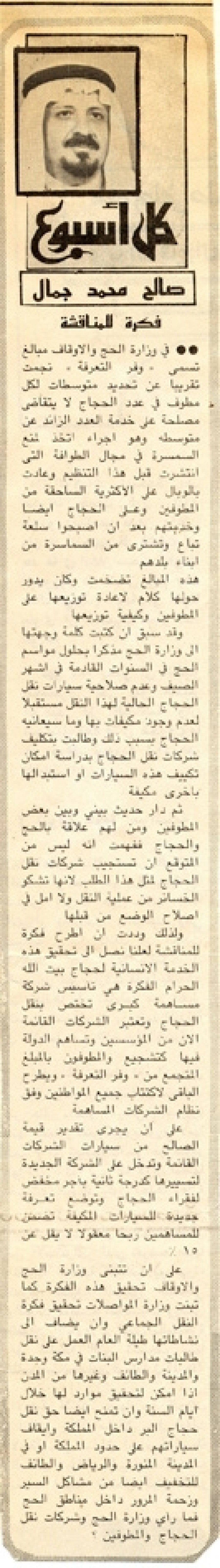 وقد سبق أن كتبت كلمة وجهتها إلى وزارة الحج مذكرا بحلول مواسم الحج في السنوات القادمة في أشهر الصيف وعدم صلاحية سيارات نقل الحجاج الحالية لهذا النقل مستقبلا لعدم وجود مكيفات بها وما سيعانيه الحجاج بسبب ذلك وطالبت بتكليف شركات نقل الحجاج بدراسة إمكان تكييف هذه السيارات أو استبدالها بأخرى مكيفة.