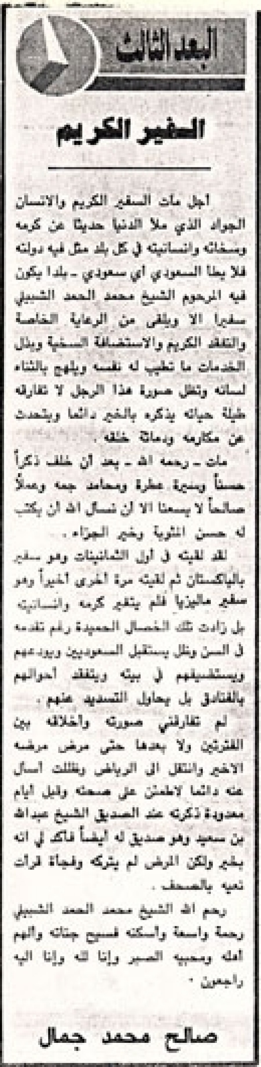 أجل مات السفير الكريم والإنسان الجواد الذي ملأ الدنيا حديثاً عن كرمة وسخائه وإنسانيته في كل بلد مثل فيه دولته فلا يطأ السعودي أي سعودي- بلدا ًيكون فيه المرحوم الشيخ محمد الحمد الشبيلي سفيراً إلا ويلقي من الرعاية الخاصة والتفقد الكريم والإستضافة السخية وبذل الخدمات ما تطيب له نفسه ويلهج بالثناء لسانه وتظل صورة هذا الرجل لا تفارقه طيلة حياته يذكره بالخير دائماً ويتحدث عن مكارمه ودماثة خلقه.