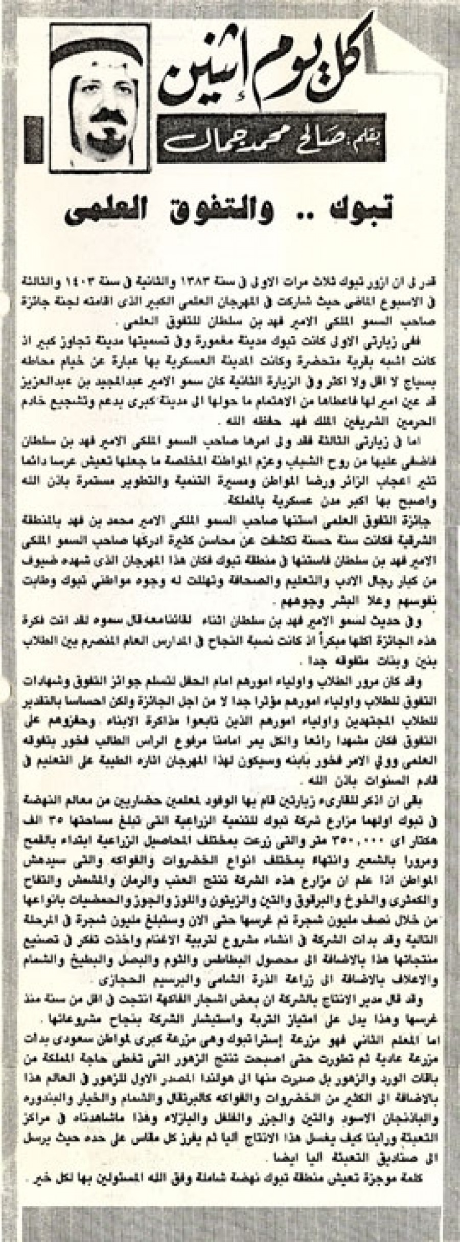 جائزة التفوق العلمي استنها صاحب السمو الملكي الأمير محمد بن فهد بالمنطقة الشرقية فكانت سنة حسنة تكشفت عن محاسن كثيرة أدركها صاحب السمو الملكي الأمير فهد بن سلطان فاستنها في منطقة تبوك فكان هذا المهرجان الذي شهده ضيوف من كبار رجال الأدب والتعليم والصحافة وتهللت له وجوه مواطني تبوك وطابت نفوسهم وعلا البشر وجوههم وفي حديث لسمو الأمير فهد بن سلطان أثناء لقائنا معه قال سموه لقد أتت فكرة هذه الجائزة أكلها مبكراً إذ كانت نسبة النجاح في المدارس العام المنصرم بين الطلاب بنين وبنات متفوقة جداً.