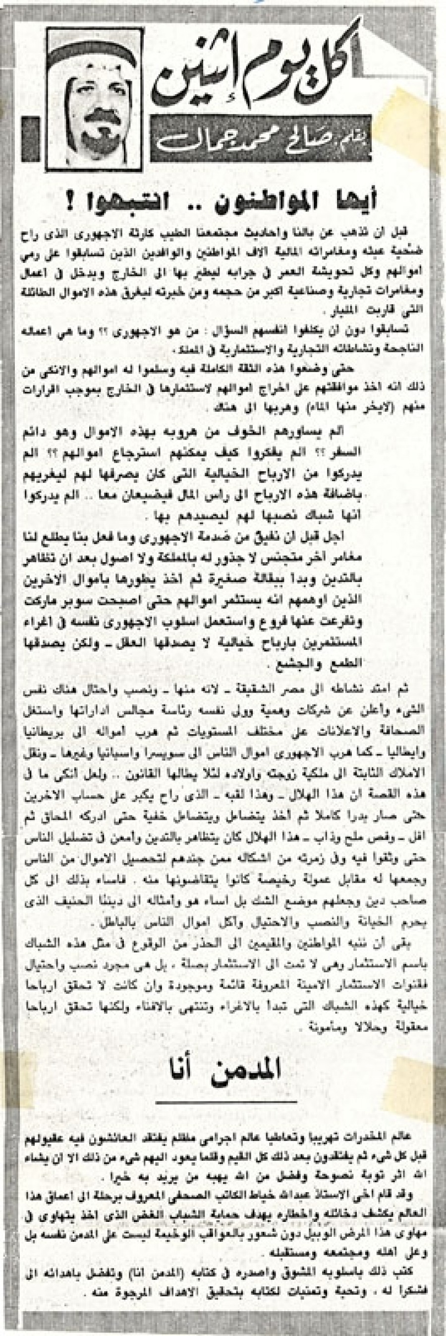 أجل قبل أن نفيق من صدمة الاجهوري وما فعل بنا يطلع لنا مغامر آخر متجنس لا جذور له بالمملكة ولا أصول بعد أن تظاهر بالتدين وبدأ ببقالة صغيرة ثم أخذ يطورها بأموال الآخرين الذين أوهمهم أنه يستثمر أموالهم حتى أصبحت سوبر ماركت وتفرعت عنها فروع وأستعمل أسلوب الاجهوري نفسه في إغراء المستثمرين بأرباح خيالية لا يصدقها العقل – ولكن يصدقها الطمع والجشع.