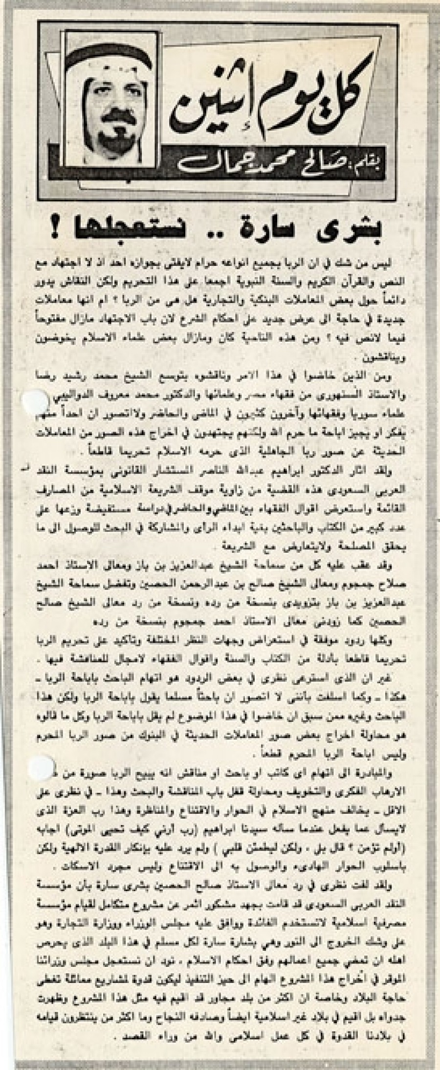 ولقد أثار الدكتور إبراهيم عبد الله الناصر المستشار القانوني بمؤسسة النقد العربي السعودي هذه القضية من زاوية موقف الشريعة الإسلامية من المصارف القائمة واستعرض أقوال الفقهاء بين الماضي والحاضر في دراسة مستفيضة وزعها على عدد كبير من الكتاب والباحثين بغية إبداء الرأي والمشاركة في البحث للوصول إلي ما يحقق المصلحة ولا يتعارض مع الشريعة.