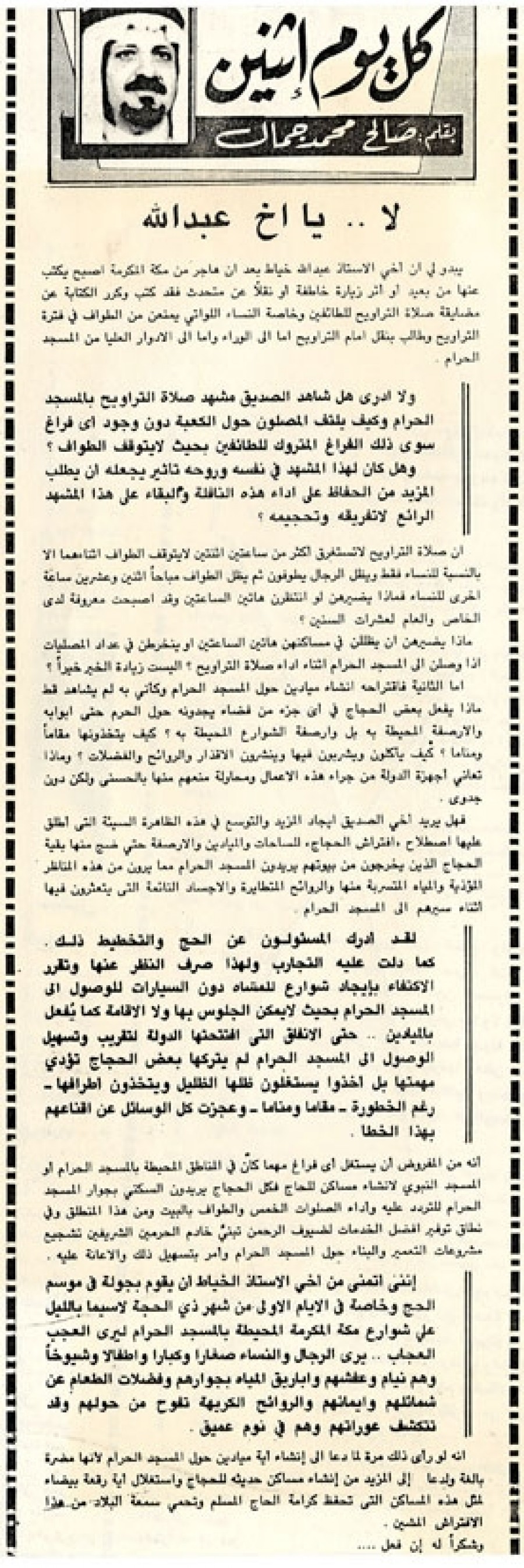 إنني أتمني من أخي الأستاذ الخياط أن يقوم بجولة في موسم الحج وخاصة في الأيام الأولي من شهر ذي الحجة لاسيما بالليل على شوارع مكة المكرمة المحيطة بالمسجد الحرام ليري العجب العجاب..يري الرجال والنساء صغارا وكبارا وأطفالا وشيوخاً وهم نيام وعفشهم وأباريق المياه بجوارهم وفضلات الطعام عن شمائلهم وإيمانهم والروائح الكريهة تفوح من حولهم وقد تتكشف عوراتهم وهم في نوم عميق.