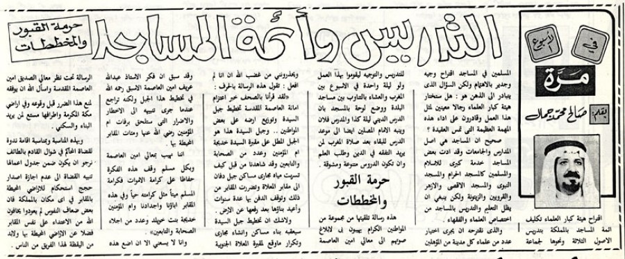 إننا نهيب بمعالي أمين العاصمة وبكل مسلم وقف هذه الفكرة حفاظا على كرامة الأموات فكرامة المسلم ميتا مثل كرامته حياً وفي هذه المقابر آباؤنا وأجدادنا وأم المؤمنين خديجة بنت خويلد وعدد من إجلاء الصحابة والتابعين" وأنا لا يسعني إلا أن أضع هذه الرسالة تحت نظر معالي الصديق أمين العاصمة المقدسة وأسأل الله أن يوفقه لمنع هذا الضرر قبل وقوعه وفي أراضي مكة المكرمة وأطرافها متسع لمن يريد البناء والسكني.