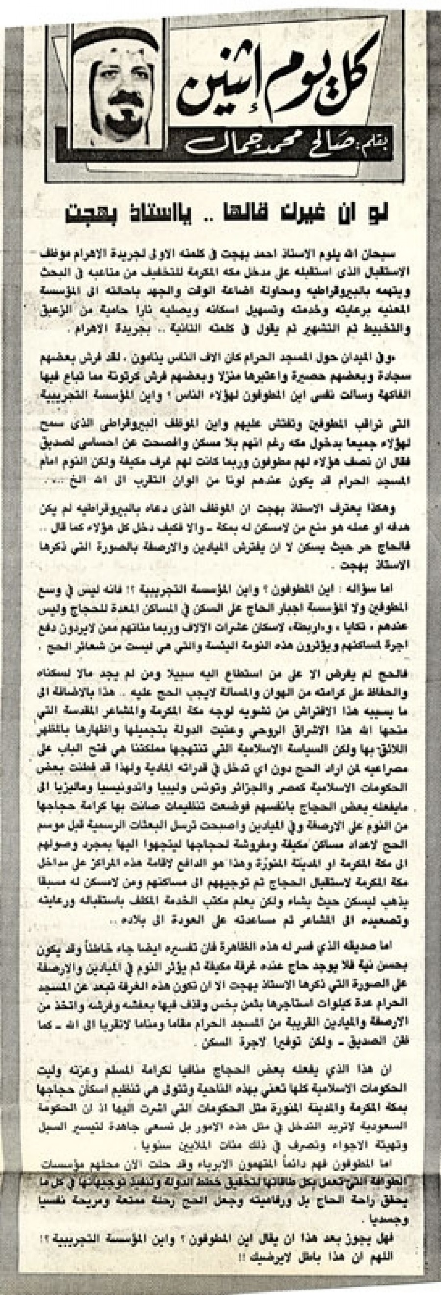 سبحان الله يلوم الأستاذ أحمد بهجت في كلمته الأولي لجريدة الأهرام موظف الاستقبال الذي استقبله على مدخل مكة المكرمة للتخفيف من متاعبه في البحث ويتهمه بالبيروقراطية ومحاولة إضاعة الوقت والجهد بإحالته إلي المؤسسة المعنية برعايته وخدمته وتسهيل إسكانه ويصليه ناراً حامية من الزعيق والتخبيط ثم التشهير ثم يقول في كلمته الثانية.. بجريدة الأهرام