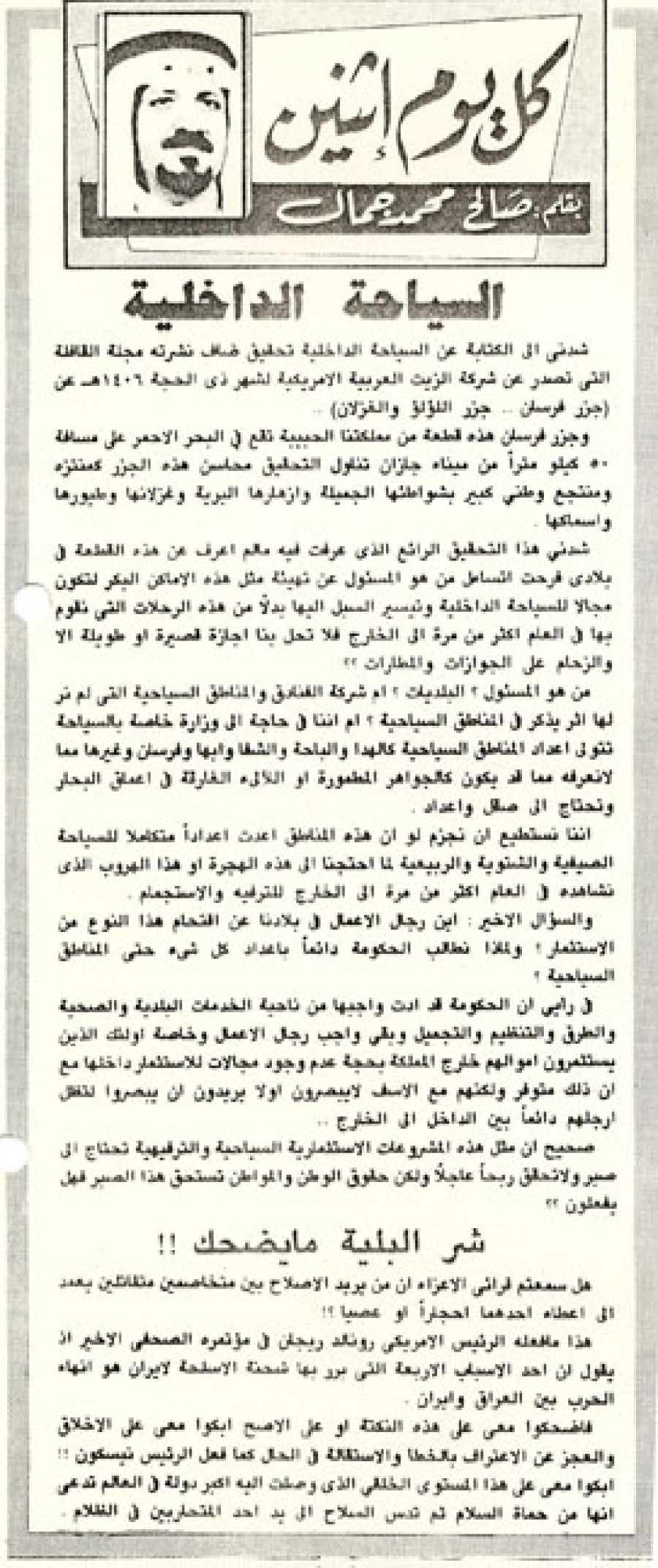 شدني إلى الكتابة عن السياحة الداخلية تحقيق ضاف نشرته مجلة القافلة التي تصدر عن شركة الزيت العربية الأمريكية لشهر ذى الحجة 1406 ﻫ عن ( جزر فرسان.. جزر اللؤلؤ والغزلان )