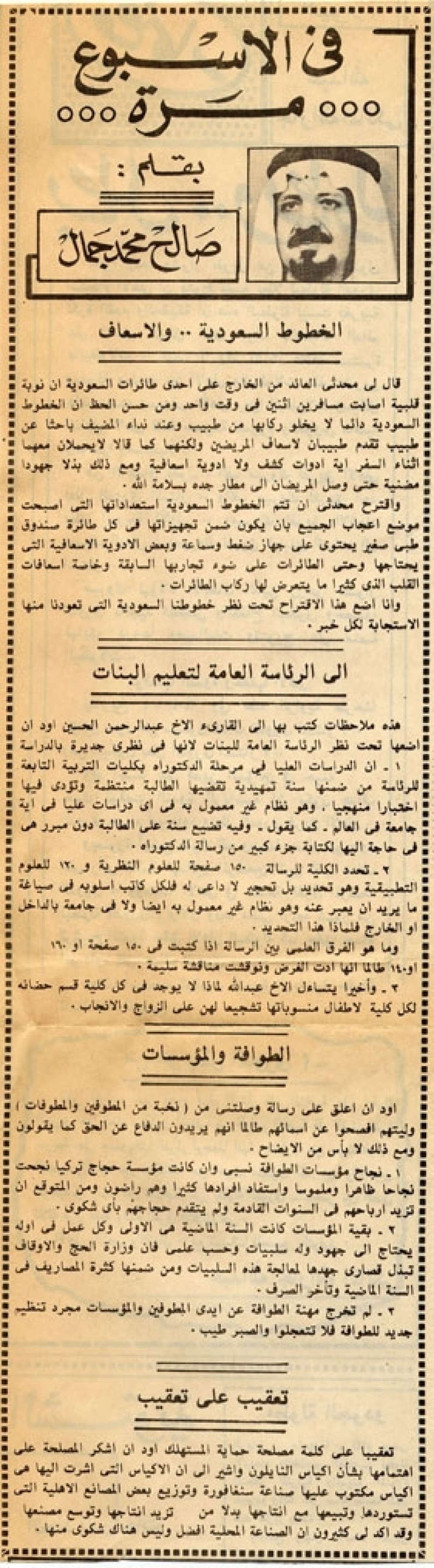 هذه ملاحظات كتب بها إلى القارئ الأخ عبدالرحمن الحسين أود أن أضعها تحت نظر الرئاسة العامة للبنات لأنها في نظري جديرة بالدراسة.
