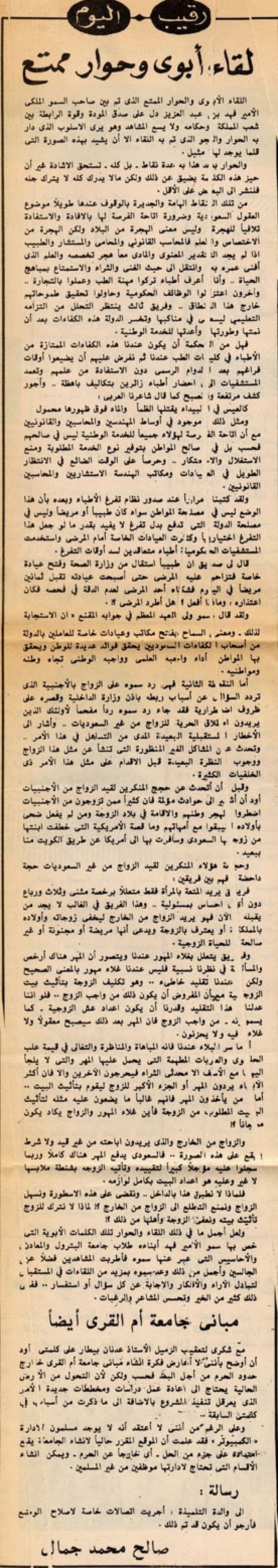 اللقاء الأبوي والحوار الممتع الذي تم بين صاحب السمو الملكي الأمير فهد بن عبد العزيز دل على صدق المودة وقوة الرابطة بين شعب المملكة وحكامه ولا يسع المشاهد وهو يرى الأسلوب الذي دار به الحوار والجو الذي تم به اللقاء إلا أن يشيد بهذه الصورة التي قلما يوجد لها مثيل.