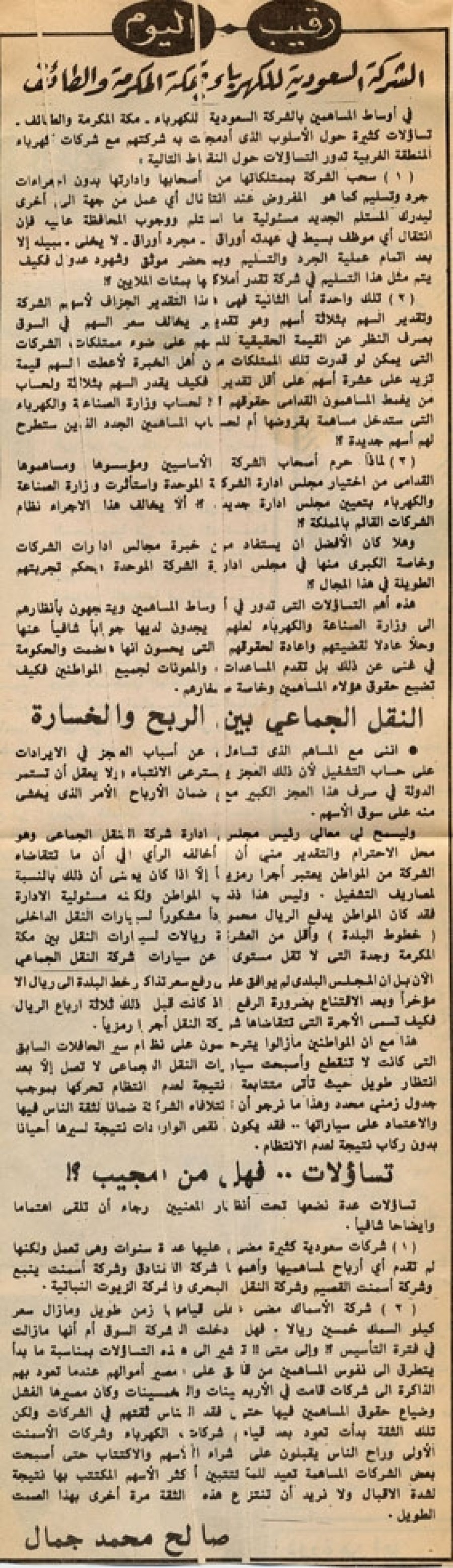 (2) شركة الأسماك مضى على قيامها زمن طويل وما زال سعر كيلو السمك خمسين ريالا. فهل دخلت الشركة السوق أم أنها ما زالت في فترة التأسيس؟! وإلى متى؟! نشير إلى هذه التساؤلات بمناسبة ما بدأ يتطرق إلى نفوس المساهمين من قلق على مصير أموالهم عندما تعود بهم الذاكرة إلى شركات قامت في الأربعينات والخمسينات وكان مصيرها الفشل وضياع حقوق المساهمين فيها حتى فقد الناس ثقتهم في الشركات ولكن تلك الثقة بدأت تعود بعد قيام شركات الكهرباء وشركات الأسمنت الأولى وراح الناس يقبلون على شراء الأسهم والاكتتاب حتى أصبحت بعض الشركات المساهمة تعيد للمكتتبين أكثر الأسهم المكتتب بها نتيجة لشدة الإقبال ولا نريد أن تنتزع هذه الثقة مرة أخرى بهذا الصمت الطويل.