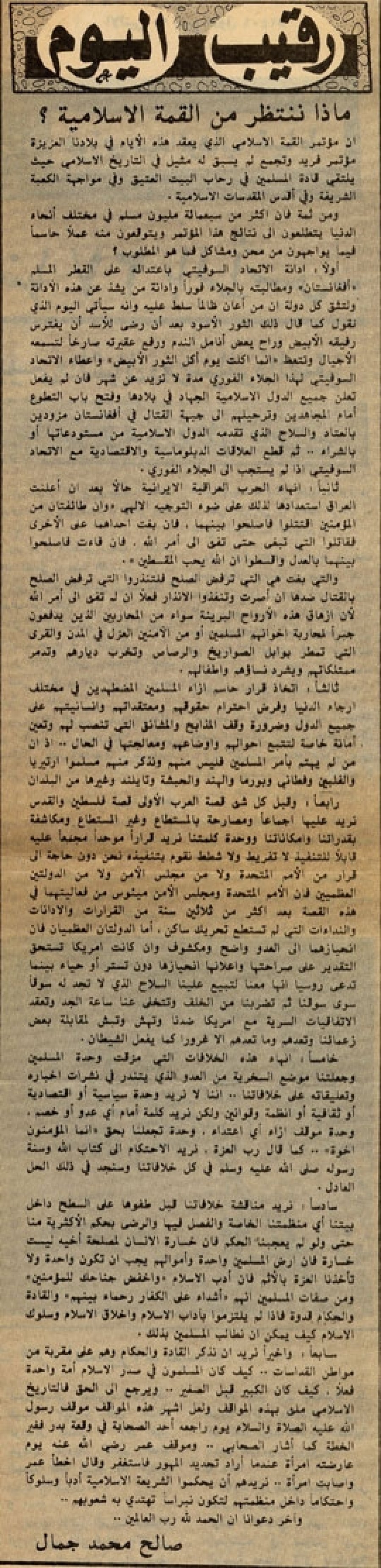 أولا: إدانة الاتحاد السوفيتي باعتدائه على القطر المسلم "أفغانستان" ومطالبته بالجلاء فورا وإدانة من يشذ عن هذه الإدانة ولتثق كل دولة أن من أعان ظالما سلط عليه وأنه سيأتي اليوم الذي نقول كما قال ذلك الثور الأسود بعد أن رضي للأسد أن يفترس رفيقه الأبيض وراح يعض أنامل الندم ورفع عقيرته صارخا لتسمعه الأجيال وتتعظ "إنما أكلت يوم أكل الثور الأبيض" وإعطاء الاتحاد السوفيتي لهذا الجلاء الفوري مدة لا تزيد عن شهر فإن لم يفعل تعلن جميع الدول الإسلامية الجهاد في بلادها وفتح باب التطوع أمام المجاهدين وترحيلهم إلى جبهة القتال في أفغانستان مزودين بالعتاد والسلاح الذي تقدمه الدول الإسلامية من مستودعاتها أو بالشراء.. ثم قطع العلاقات الدبلوماسية والاقتصادية مع الاتحاد السوفيتي إذا لم يستجب إلى الجلاء الفوري.