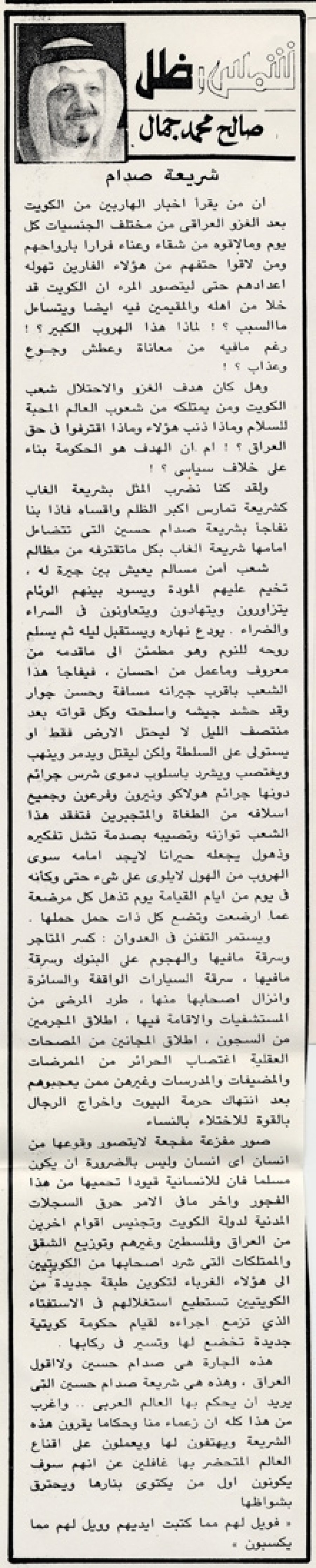 هذه الجارة هي صدام حسين ولا أقول العراق، وهذه هي شريعة صدام حسين التي يريد أن يحكم بها العالم العربي.. وأغرب من هذا كله أن زعماء منا وحكاما يقرون هذه الشريعة ويهتفون لها ويعملون على إقناع العالم المتحضر بها غافلين عن أنهم سوف يكونون أول من يكتوي بنارها ويحترق بشواظها.
