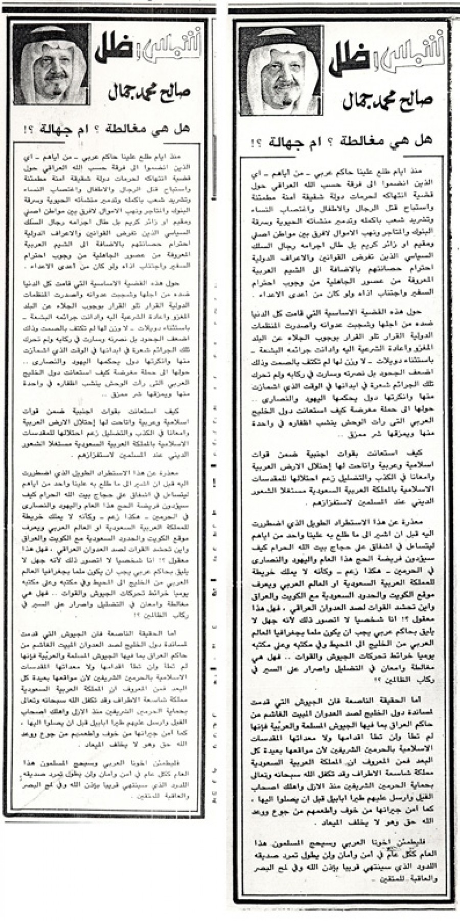 معذرة عن هذا الاستطراد الطويل الذي اضطررت إليه قبل أن أشير إلى ما طلع به علينا واحد من إياهم ليتساءل في إشفاق على حجاج بيت الله الحرام كيف سيؤدون فريضة الحج هذا العام واليهود والنصارى في الحرمين – هكذا زعم – وكأنه لا يملك خريطة للمملكة العربية السعودية أو العالم العربي ويعرف موقع الكويت والحدود السعودية مع الكويت والعراق وأين تحشد القوات لصد العدوان العراقي، فهل هذا معقول؟! أنا شخصيا لا أتصور ذلك لأنه جهل لا يليق بحاكم عربي يجب أن يكون ملما بجغرافيا العالم العربي من الخليج إلى المحيط وفي مكتبه وعلى مكتبه يوميا خرائط تحركات الجيوش والقوات.. فهل هي مغالطة وإمعان في التضليل وإصرار على السير في ركاب الظالمين؟!