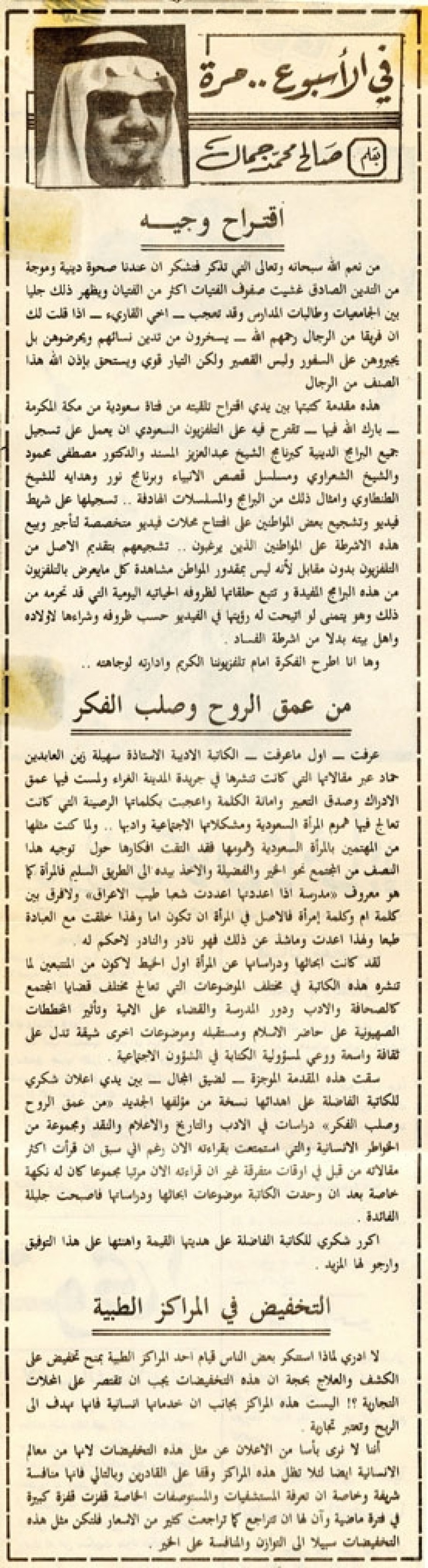 هذه مقدمة كتبتها بين يدي إقتراح تلقيته من فتاة سعودية من مكة المكرمة – بارك الله فيها – تقترح فيه على التليفزيون السعودي أن يعمل على تسجيل جميع البرامج الدينية كبرنامج الشيخ عبد العزيز المسند والدكتور مصطفي محمود والشيخ الشعراوى ومسلسل قصص الأنبياء وبرنامج نور وهداية للشيخ الطنطاوى وأمثال ذلك من البرامج والمسلسلات الدينية الهادفة.. تسجيلها على شريط فيديو وتشجيع بعض المواطنين على إفتتاح محلات فيديو متخصصة لتأجير وبيع هذه الأشرطة على المواطنين الذين يرغبون.. تشجيعهم بتقديم الأصل من التليفزيون بدون مقابل لأنه ليس بمقدور المواطن مشاهدة كل ما يعرض بالتليفزيون من هذه البرامج المفيدة وتتبع حلقاتها لظروفه الحياتية اليومية التي قد تحرمه من ذلك وهو يتمنى لو أتيحت له رؤيتها في الفيديو حسب ظروفه وشراءها لأولاده وأهل بيته بدلاً من أشرطة الفساد.