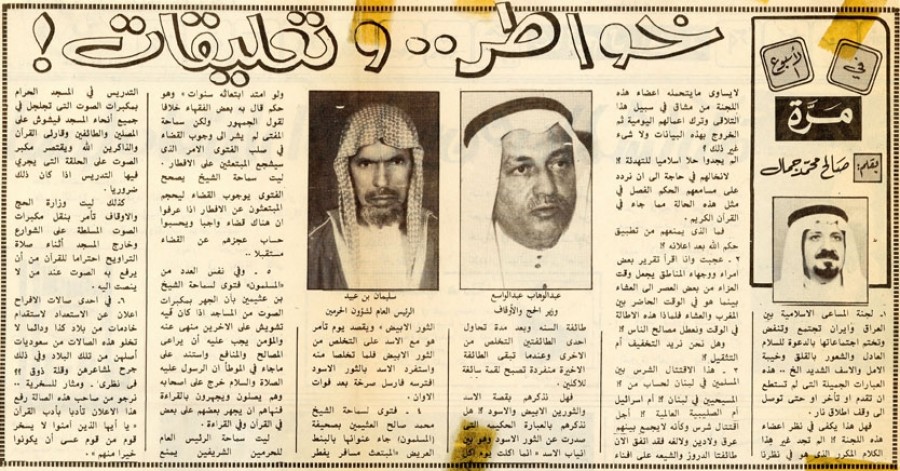 5. وفي نفس العدد من "المسلمون" فتوى لسماحة الشيخ بن عثيمين بأن الجهر بمكبرات الصوت من المساجد إذا كان فيه تشويش على الآخرين منهي عنه والمؤمن يجب عليه أن يراعي المصالح والمنافع واستند على ما جاء في الموطأ أن الرسول - عليه الصلاة والسلام - خرج على أصحابه وهم يصلون ويجهرون بالقراءة فنهاهم أن يجهر بعضهم على بعض في القرآن وفي القراءة.