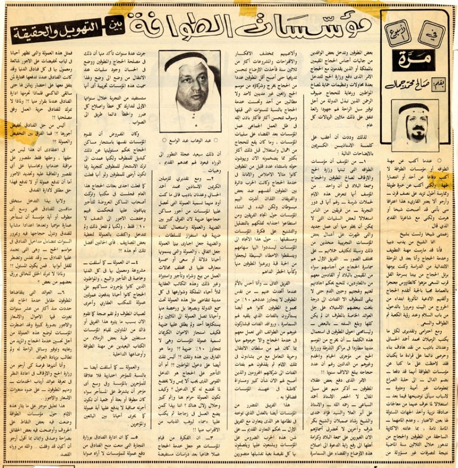 ومع إحترامي وتقديري لكل ما يكتب الزميلان محمد أحمد الحساني وعدنان بأديب من نقد هادف بناء وحرصي دائماً على قراءة ما يكتبان فقد لاحظت على ما كتبا عن مؤسسات الطوافة أنهما قد دفعا- بضم الدال- إلي حلبة الصراع بمعلومات غير أمينة ومثيرة- لأسباب سيأتي توضيحها فيما بعد- إستغلالاً لما عرف عنهما من معالجات صادقة نزيهة وأخذ الجهات المسئولة لها بعين الاعتبار، وعدم إلمامهما- إلمامة تامة، بما عانته الأكثرية الساحقة من المطوفين والحجاج من تدهور خلال الثلاثين سنة الماضية نتيجة لتصرفات غير مسئولة من بعض المطوفين وتدخل بعض الوافدين من جاليات أجناس الحجاج المقيمين بالمملكة أو الذين يقدمون مع الحجاج الأمر الذي دفع وزارة الحج للتدخل بعدة محاولات وتنظيمات حماية لمصالح المواطنين ورعاية للحجاج ضيوف الرحمن الذين تبذل الدولة من أجل توفير سبل الراحة لهم جهوداً رائعة وتنفق على ذلك ملايين الريالات كل عام.