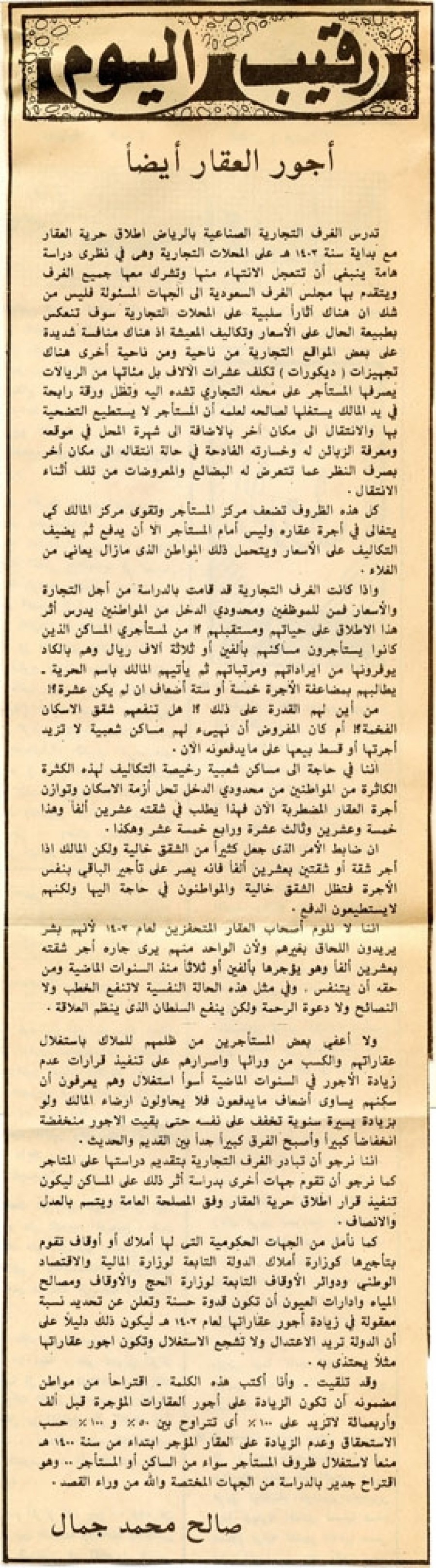 وقد تلقيت – وأنا أكتب هذه الكلمة – اقتراحاً من مواطن مضمونه أن تكون الزيادة على أجور العقارات المؤجرة قبل ألف وأربعمائة لا تزيد على 100% أي تتراوح بين 50% و 100% حسب الاستحقاق وعدم الزيادة على العقار المؤجر ابتداء من سنة 1400ﻫ منعاً لاستغلال ظروف المستأجر سواء من الساكن أو المستأجر.. وهو اقتراح جدير بالدراسة من الجهات المختصة والله من وراء القصد.