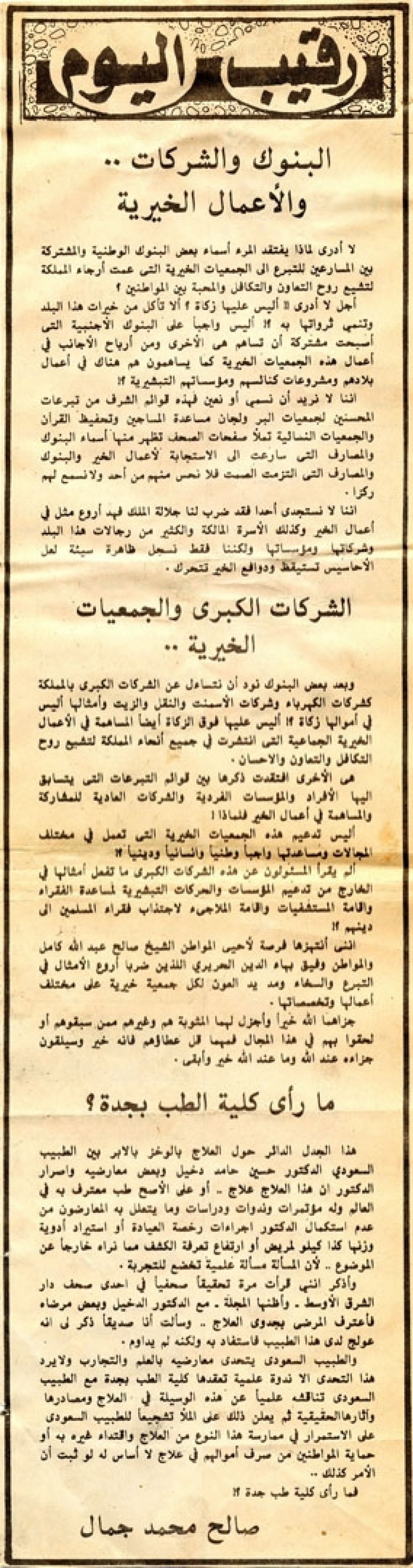 إننا لا نستجدى أحداً فقد ضرب لنا جلالة الملك فهد أروع مثل في أعمال الخير وكذلك الأسرة المالكة والكثير من رجالات هذا البلد وشركاتها ومؤسساتها ولكننا فقط نسجل ظاهرة سيئة لعل الأحاسيس تستيقظ ودوافع الخير تتحرك.