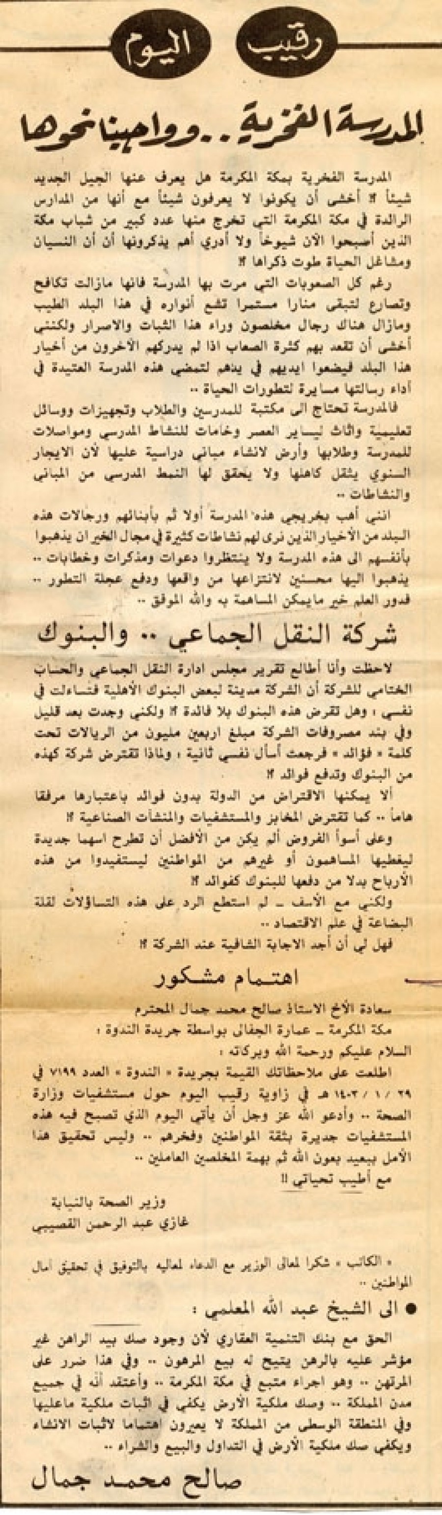 إنني أهيب بخريجي هذه المدرسة أولاً ثم بأبنائهم ورجالات هذه البلد من الأخيار الذين نرى لهم نشاطات كثيرة في مجال الخير أن يذهبوا بأنفسهم إلى هذه المدرسة ولا ينتظروا دعوات ومذكرات وخطابات.. يذهبوا إليها محسنين لانتزاعها من واقعها ودفع عجلة التطور.. فدور العلم خير ما يمكن المساهمة به والله الموفق..