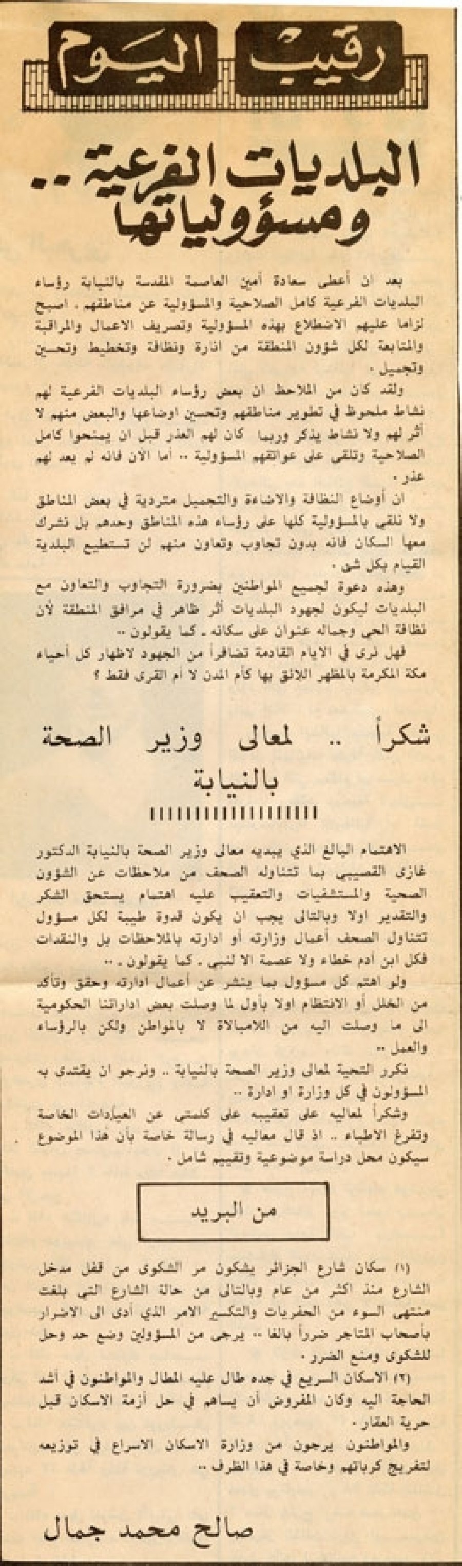 وهذه دعوة لجميع المواطنين بضرورة التجاوب والتعاون مع البلديات ليكون لجهود البلديات أثر ظاهر في مرافق المنطقة لأن نظافة الحي وجماله عنوان على سكانه – كما يقولون..