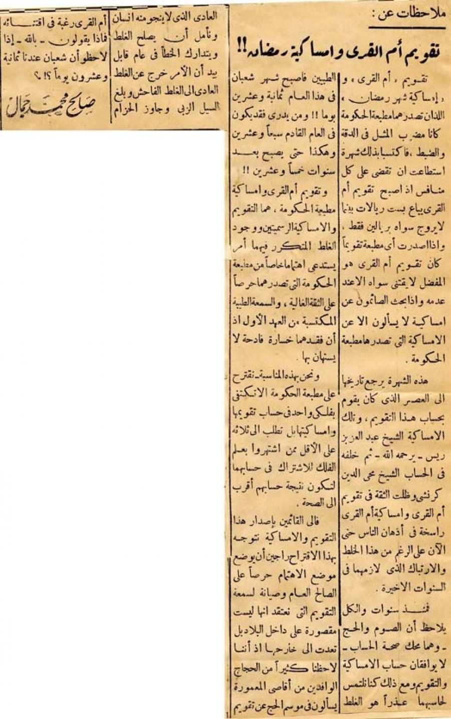 فإلى القائمين بإصدار هذا التقويم والإمساكية نتوجه بهذا الاقتراح راجين أن يوضع موضع الاهتمام حرصاً على الصالح العام وصيانة لسمعة التقويم التي نعتقد أنها ليست مقصورة على داخل البلاد بل تعدت إلى خارجها إذ أننا لاحظنا كثيراً من الحجاج الوافدين من أقاصي المعمورة يسألون في موسم الحج عن تقويم العادي الذي لا ينجو منه إنسان ونأمل أن يصلح الغلط ويتدارك الخطأ في عام قابل بيد أن الأمر خرج عن الغلط العادي إلى الغلط الفاحش وبلغ السيل الزبى وجاوز الحزام أم القرى رغبة في اقتنائه فماذا يقولون – بالله – إذا لاحظو أن شعبان عندنا ثمانية وعشرون يوما؟!