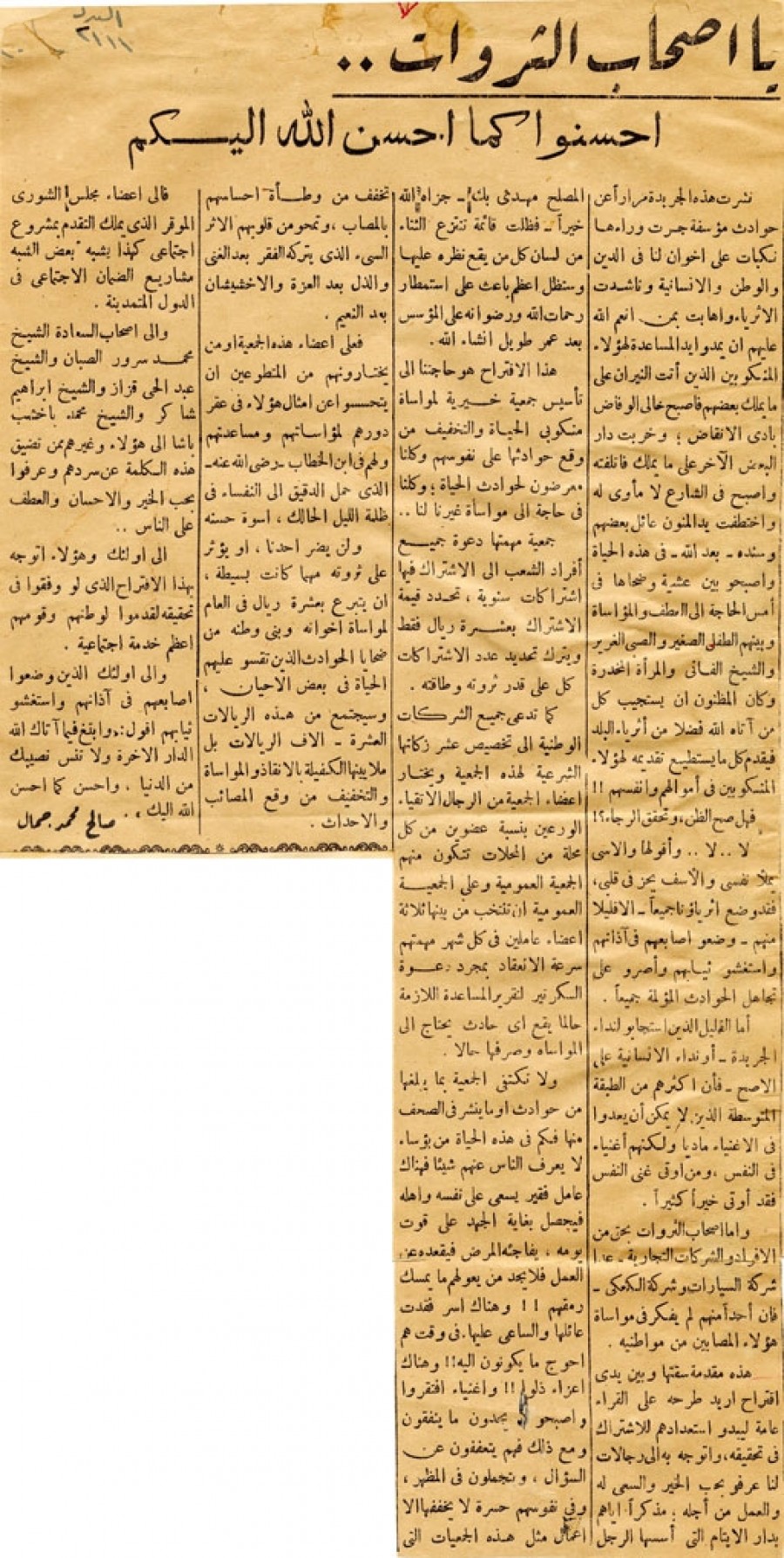 نشرت هذه الجريدة مراراً عن حوادث مؤسفة جرت وراءها نكبات على إخوان لنا في الدين والوطن والإنسانية وناشدت الأثرياء وأهابت بمن أنعم الله عليهم أن يمدوا يد المساعدة لهؤلاء المنكوبين الذين أتت النيران على ما يملك بعضهم فأصبح خالي الوفاض بادي الأنقاض؛ وخربت دار البعض الآخر على ما يملك فأتلفته وأصبح في الشارع لا مأوى له واختطفت يد المنون عائل بعضهم وسنده – بعد الله – في هذه الحياة وأصبحوا بين عشية وضحاها في أمس الحاجة إلى العطف والمؤاساة وبينهم الطفل الصغير والصبي الغرير والشيخ الفاني والمرأة المخدرة وكان المظنون أن يستجيب كل من آتاه الله فضلاً من أثرياء البلد فيقدم كل ما يستطيع تقديمه لهؤلاء المنكوبين في أموالهم وأنفسهم!!