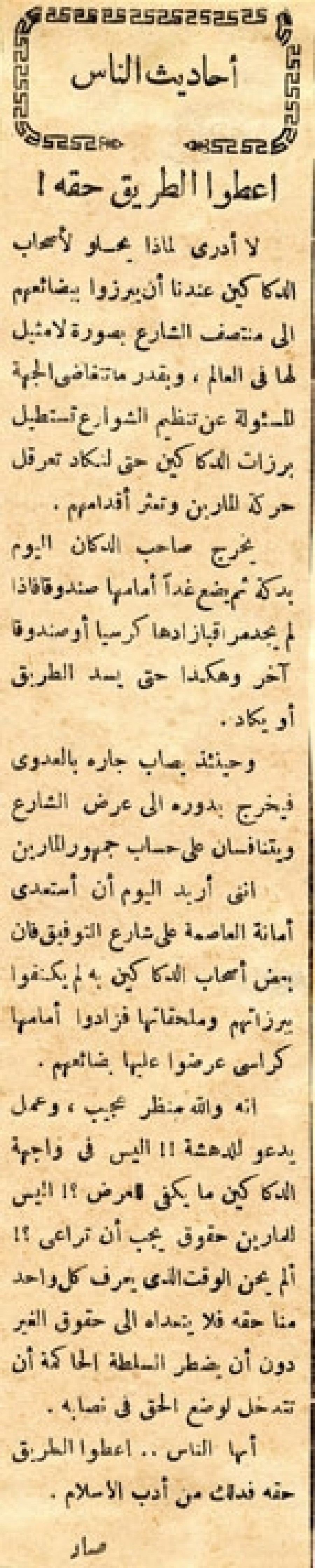 إنه والله منظر عجيب، وعمل يدعو للدهشة!! أليس في واجهة الدكاكين ما يكفي للعرض؟! أليس للمارين حقوق يجب أن تراعى؟!