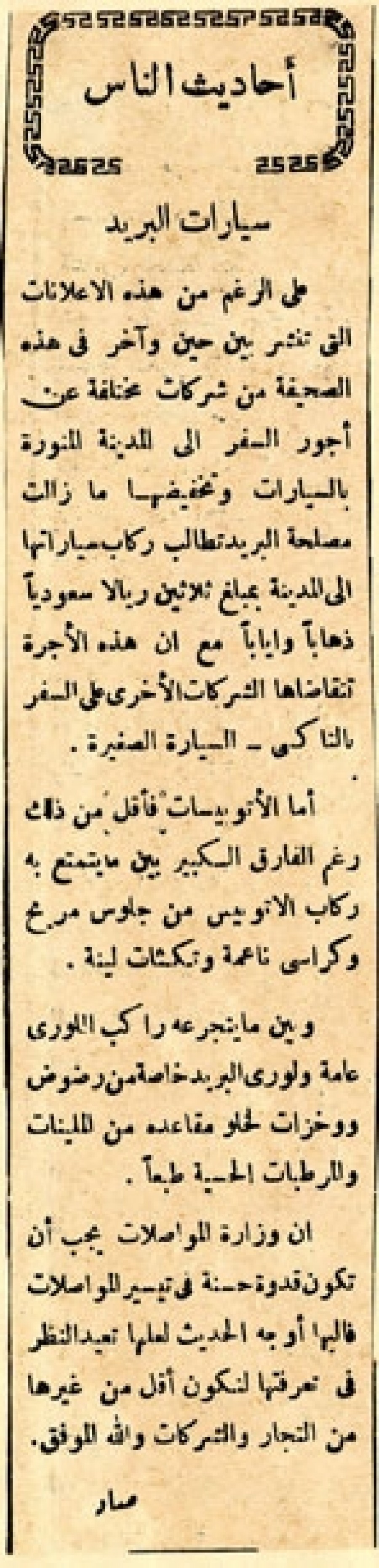 على الرغم من هذه الإعلانات التي تنشر بين حين وآخر في هذه الصحيفة من شركات مختلفة عن أجور السفر إلى المدينة المنورة بالسيارات وتخفيضها ما زالت مصلحة البريد تطالب ركاب سياراتها إلى المدينة بمبلغ ثلاثين ريالا سعوديا ذهابا وإيابا مع أن هذه الأجرة تتقاضاها الشركات الأخرى على السفر بالتاكسي – السيارة الصغيرة.