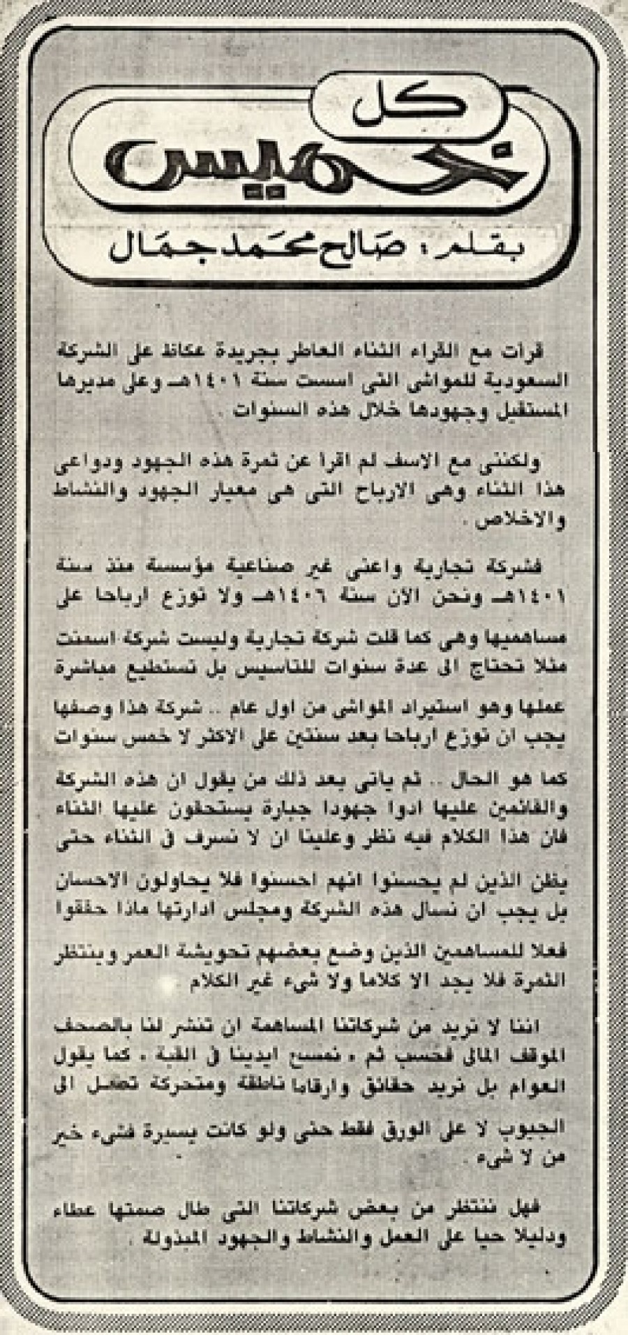 فشركة تجارية وأعني غير صناعية مؤسسة منذ سنة 1401 ﻫ ونحن الآن سنة 1406 ﻫ ولا توزع أرباحا على مساهميها وهي كما قلت شركة تجارية وليست شركة أسمنت مثلا تحتاج إلي عدة سنوات للتأسيس بل تستطيع مباشرة عملها وهو استيراد المواشي من أول عام.. شركة هذا وصفها يجب أن توزع أرباحاً بعد سنتين على الأكثر لا خمس سنوات كما هو الحال.. ثم يأتي بعد ذلك من يقول أن هذه الشركة والقائمين عليها أدوا جهودا جبارة يستحقون عليها الثناء فإن هذا الكلام فيه نظر وعلينا أن لا نسرف في الثناء حتى يظن الذين لم يحسنوا أنهم أحسنوا فلا يحاولون الإحسان بل يجب أن نسأل هذه الشركة ومجلس إداراتها ماذا حققوا فعلاً للمساهمين الذين وضع بعضهم تحويشة العمر وينتظر الثمرة فلا يجد إلا كلاماً ولا شيء غير الكلام. إننا لا نريد من شركاتنا المساهمة أن تنشر بالصحف الموقف المالي فحسب ثم " نمسح أيدينا في القبة " كما يقول العوام بل نريد حقائق وأرقاماً ناطقة ومتحركة تصل إلي الجيوب لا على الورق فقط حتى ولو كانت يسيرة فشيء خير من لا شيء.