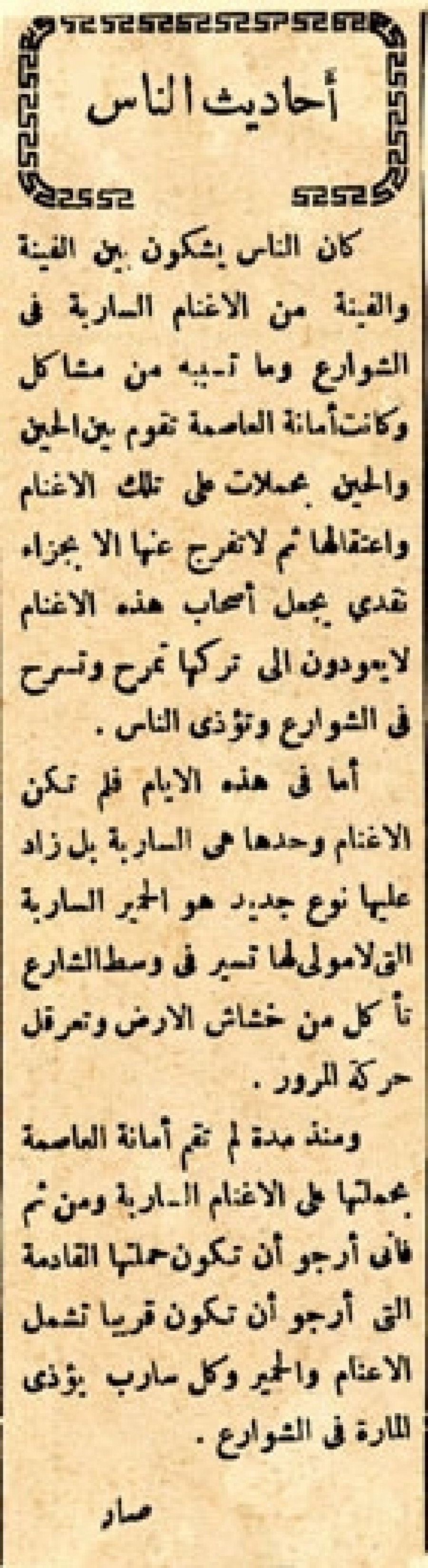 أما في هذه الأيام فلم تكن الأغنام وحدها هي السارية بل زاد عليها نوع جديد هو الحمير الساربة التي لا مولى لها تسير في وسط الشارع تأكل من خشاش الأرض وتعرقل حركة المرور.