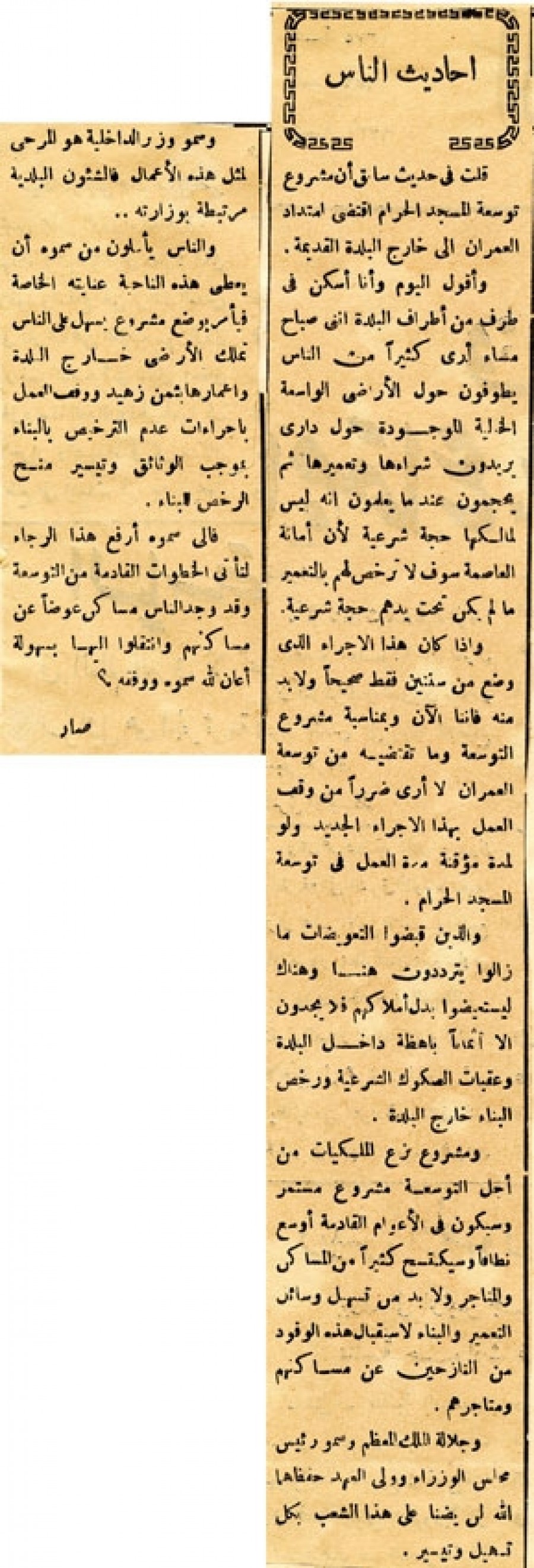 فإلى سموه أرفع هذا الرجاء لتأتي الخطوات القادمة من التوسعة وقد وجد الناس مساكن عوضا عن مساكنهم وانتقلوا إليها بسهولة أعان الله سموه ووفقه.