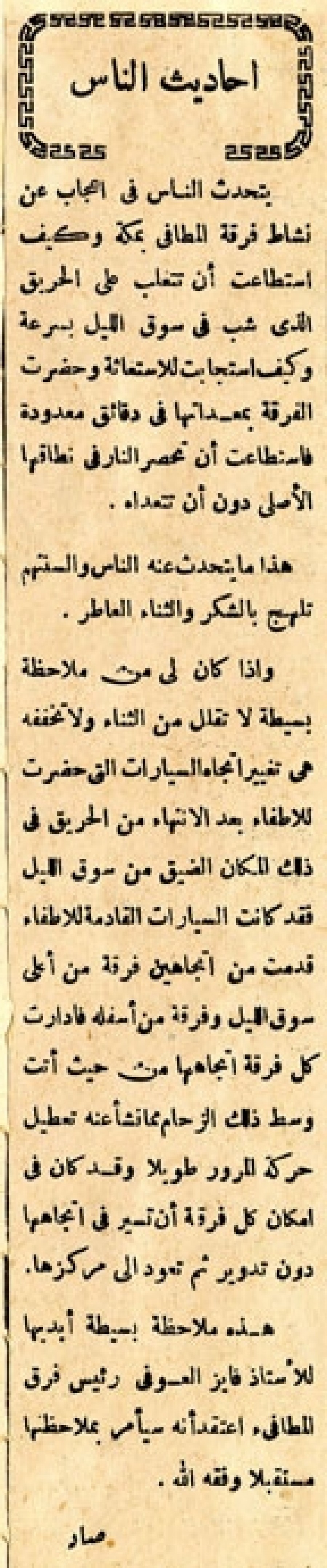 يتحدث الناس في إعجاب عن نشاط فرقة المطافي بمكة وكيف استطاعت أن تتغلب على الحريق الذي شب في سوق الليل بسرعة وكيف استجابت للاستغاثة وحضرت الفرقة بمعداتها في دقائق معدودة فاستطاعت أن تحصر النار في نطافها الأصلي دون أن تتعداه.