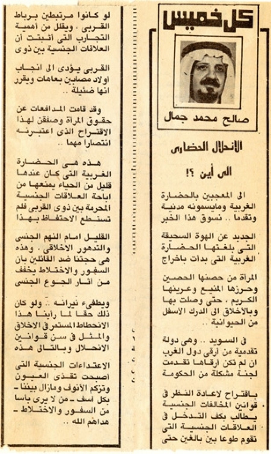 في السويد.. وهي دولة تقدمية من أرقى دول الغرب إن لم تكن أرقاها تقدمت لجنة مشكلة عن الحكومة باقتراح لإعادة النظر في قوانين المخالفات الجنسية يطالب بكف التدخل في العلاقات الجنسية التي تقوم طوعاً بين بالغين حتى لو كانوا مرتبطين برباط القربى، ويقلل من أهمية التجارب التي أثبتت أن العلاقات الجنسية بين ذوى القربى يؤدى إلى إنجاب أولاد مصابين بعاهات ويقرر إنها ضئيلة..