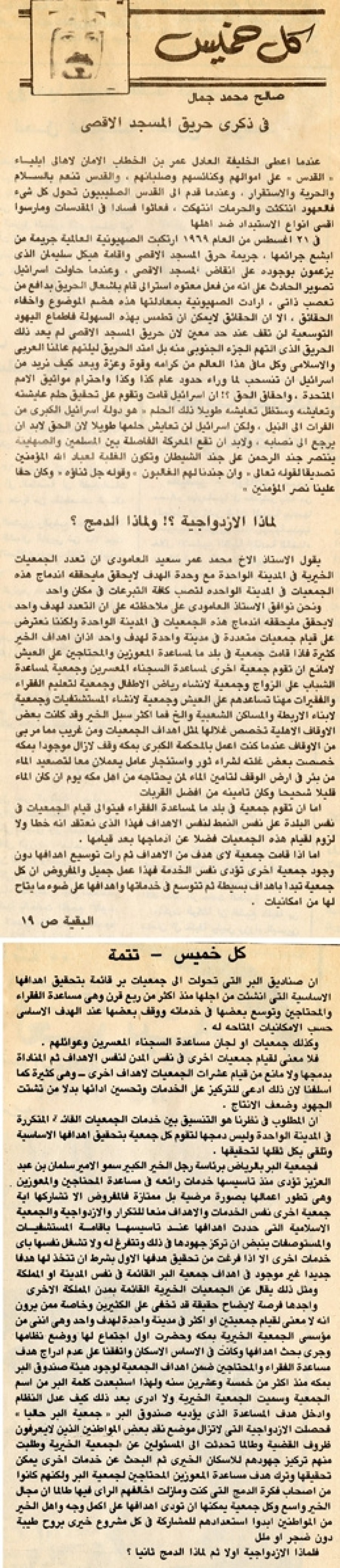 ونحن نوافق الأستاذ العمودي على ملاحظته على أن التعدد لهدف واحد لا يحقق ما يحققه اندماج هذه الجمعيات في المدينة الواحدة ولكننا نعترض على قيام جمعيات متعددة في مدينة واحدة لهدف واحد إذ أن أهداف الخير كثيرة فإذا قامت جمعية في بلد ما لمساعدة المعوزين والمحتاجين على العيش لا مانع أن تقوم جمعية أخرى لمساعدة السجناء المعسرين وجمعية لمساعدة الشباب على الزواج وجمعية لإنشاء رياض الأطفال وجمعية لتعليم الفقراء والفقيرات مهنا تساعدهم على العيش وجمعية لإنشاء المستشفيات وجمعية لأبناء الأربطة والمساكن الشعبية وإلخ فما أكثر سبل الخير وقد كانت بعض الأوقاف الأهلية تخصص غلالها لمثل أهداف الجمعيات ومن غريب مما مر بى من الأوقاف عندما كنت أعمل بالمحكمة الكبرى بمكة وقف لا زال موجوداً بمكة خصصت بعض غلته لشراء ثور واستئجار عامل يعملان معاً لتصعيد الماء من بئر في أرض الوقف لتأمين الماء لمن يحتاجه من أهل مكة يوم أن كان الماء قليلاً شحيحاً وكان تأمينه من أفضل القربات.