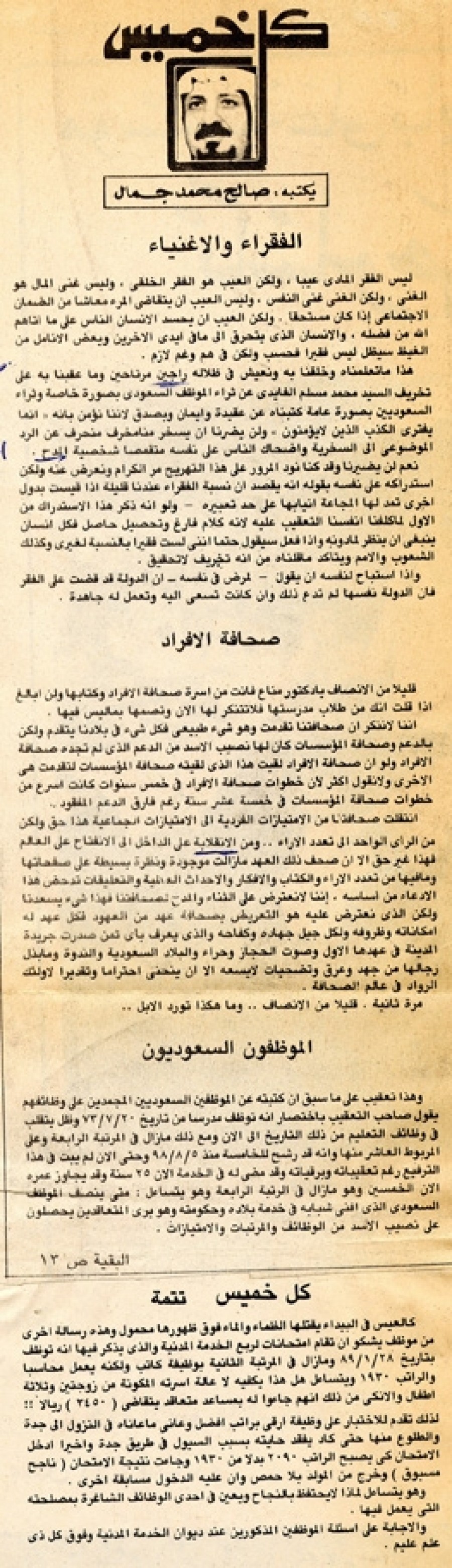 انتقلت صحافتنا من الامتيازات الفردية إلى الامتيازات الجماعية هذا حق ولكن من الرأي الواحد إلى تعدد الآراء.. ومن الانقلابة على الداخل إلى الانفتاح على العالم فهذا غير حق إلا أن صحف ذلك العهد ما زالت موجودة ونظرة بسيطة على صفحاتها وما فيها من تعدد الآراء والكتاب والأفكار والأحداث العالمية والتعليقات تدحض هذا الادعاء من أساسه، إننا لا نعترض على الثناء والمدح لصحافتنا فهذا شئ يسعدنا ولكن الذي نعترض عليه هو التعريض بصحافة عهد من العهود فكل عهد له إمكاناته وظروفه ولكل جيل جهاده وكفاحه والذي يعرف بأي ثمن صدرت جريدة المدينة في عهدها الأول وصوت الحجاز وحراء والبلاد السعودية والندوة وما بذل رجالها من جهد وعرق وتضحيات لا يسعه إلا أن ينحني احتراماً وتقديراً لأولئك الرواد في عالم الصحافة.