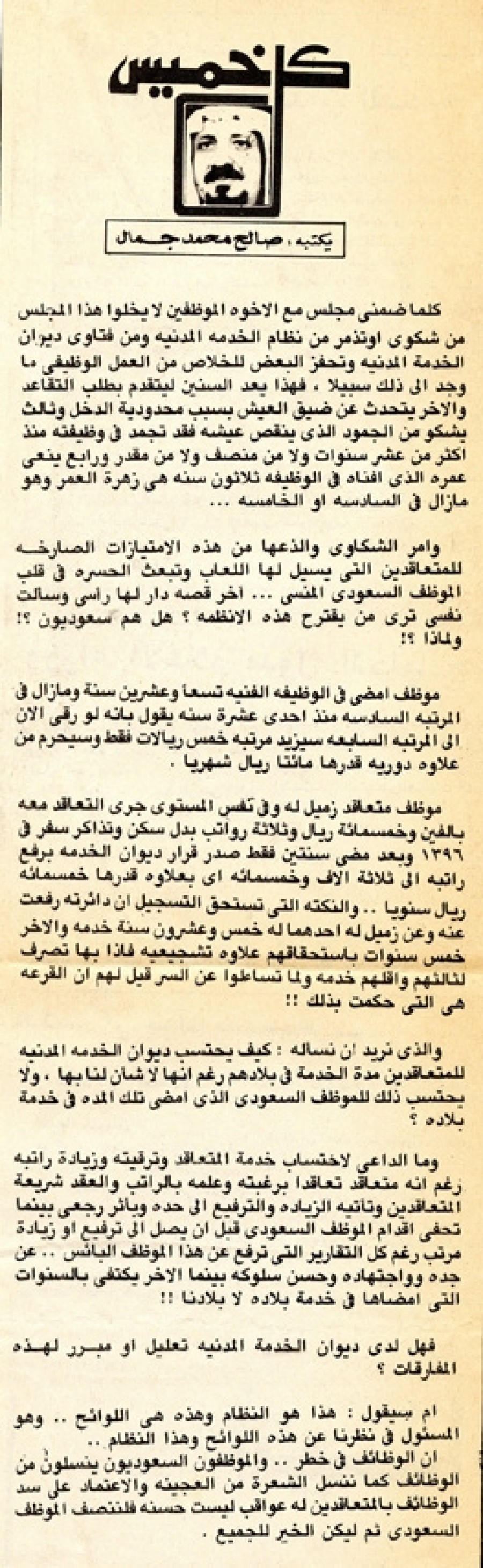 موظف متعاقد زميل له وفي نفس المستوى جرى التعاقد معه بألفين وخمسمائة ريال وثلاثة رواتب بدل سكن وتذاكر سفر في 1396 وبعد مضى سنتين فقط صدر قرار ديوان الخدمة برفع راتبه إلى ثلاثة آلاف وخمسمائة أى بعلاوة قدرها خمسمائة ريال سنوياً.. والنكتة التي تستحق التسجيل أن دائرته رفعت عنه وعن زميل له أحدهما له خمس وعشرون سنة خدمة والآخر خمس سنوات باستحقاقهم علاوة تشجيعية فإذا بها تصرف لثالثهم وأقلهم خدمة ولما تساءلوا عن السر قيل لهم أن القرعة هي التي حكمت بذلك!!
