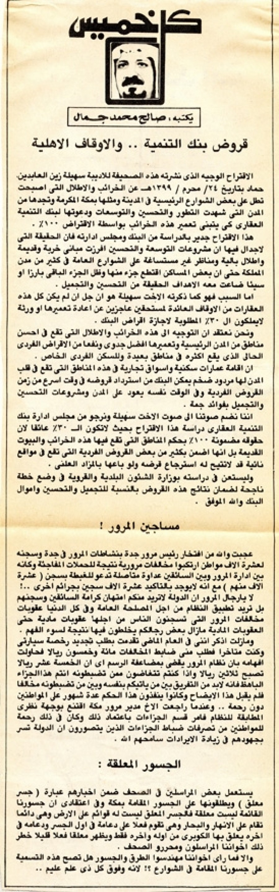 الاقتراح الوجيه الذي نشرته هذه الصحيفة للأديبة سهيلة زين العابدين حماد بتاريخ 24 / محرم / 1399ﻫ عن الخرائب والأطلال التي أصبحت تطل على بعض الشوارع الرئيسية في المدينة ومثلها بمكة المكرمة وتجدها من المدن التي شهدت التطور والتحسين والتوسعات ودعوتها لبنك التنمية العقاري كي يتبنى تعمير هذه الخرائب بواسطة الاقتراض 100٪.