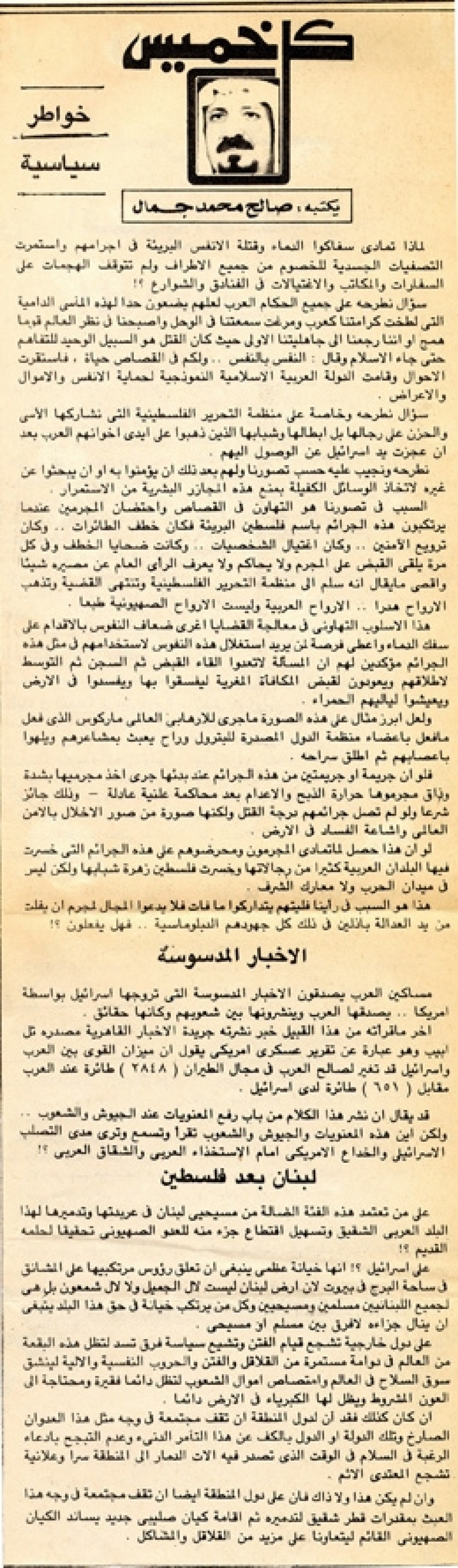 سؤال نطرحه وخاصة على منظمة التحرير الفلسطينية التي نشاركها الأسى والحزن على رجالها بل أبطالها وشبابها الذين ذهبوا على أيدي إخوانهم العرب بعد أن عجزت يد إسرائيل عن الوصول إليهم.
