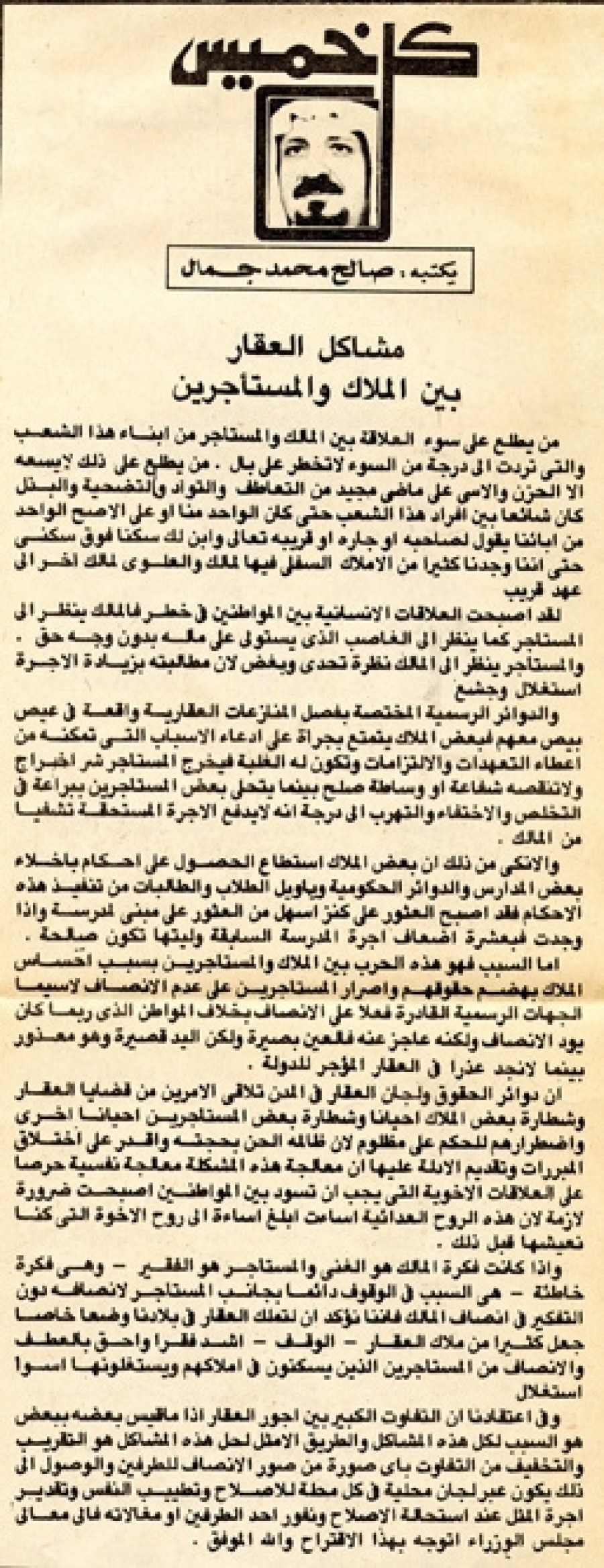 من يطلع على سوء العلاقة بين المالك والمستأجر من أبناء هذا الشعب والتي تردت إلى درجة من السوء لا تخطر على بال. من يطلع على ذلك لا يسعه إلا الحزن والأسى على ماضي مجيد من التعاطف والتواد والتضحية والبذل كان شائعاً بين أفراد هذا الشعب حتى كان الواحد منا أو على الأصح الواحد من أبنائنا يقول لصاحبه أو جاره أو قريبه تعالى وابن لك سكناً فوق سكني حتى أننا وجدنا كثيراً من الأملاك السفلى فيها لمالك والعلوي لمالك آخر إلى عهد قريب.