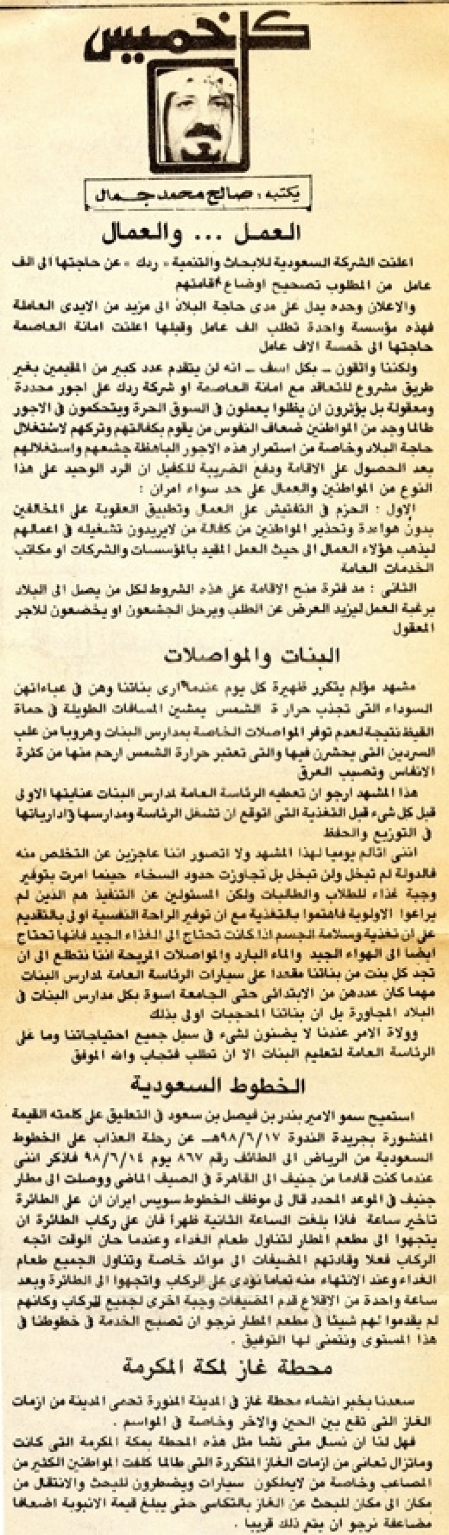 ولكننا واثقون – بكل أسف – أنه لن يتقدم عدد كبير من المقيمين بغير طريق مشروع للتعاقد مع أمانة العاصمة أو شركة ردك على أجور محددة ومعقولة بل يؤثرون أن يظلوا يعملون في السوق الحرة ويتحكمون في الأجور طالما وجد من المواطنين ضعاف النفوس من يقوم بكفالتهم وتركهم لاستغلال حاجة البلاد وخاصة من استمرار هذه الأجور الباهظة جشعهم واستغلالهم بعد الحصول على الإقامة ودفع الضريبة للكفيل إن الرد الوحيد على هذا النوع من المواطنين والمال على حد سواء أمران: