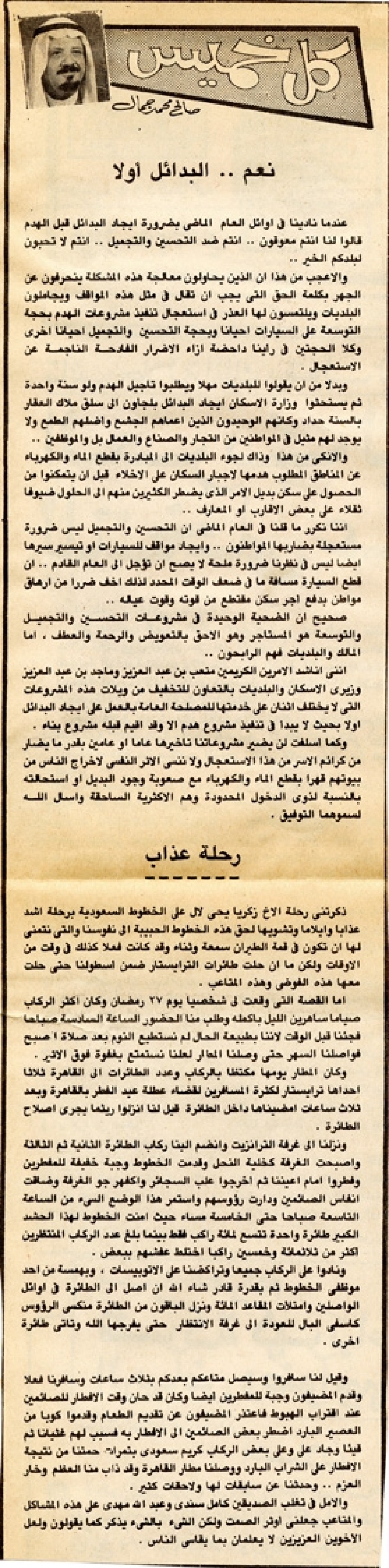 إنني أناشد الأميرين الكريمين متعب بن عبد العزيز وماجد بن عبد العزيز وزيري الإسكان والبلديات بالتعاون للتخفيف من ويلات هذه المشروعات التي لا يختلف اثنان على خدمتها للمصلحة العامة بالعمل على إيجاد البدائل أولاً بحيث لا يبدأ في تنفيذ مشروع هدم إلا وقد أقيم قبله مشروع بناء.